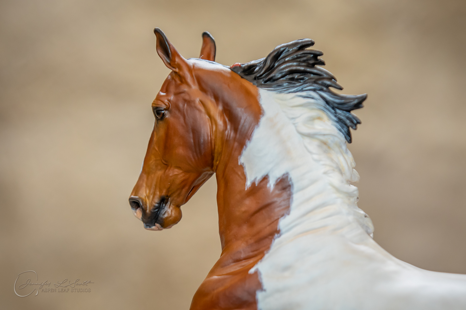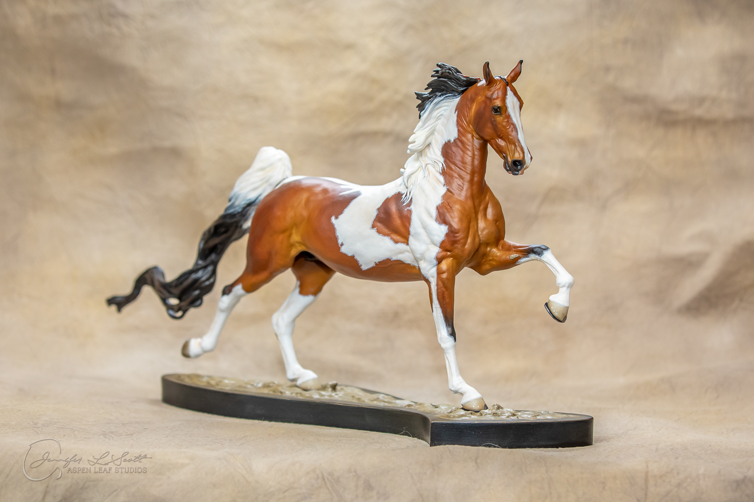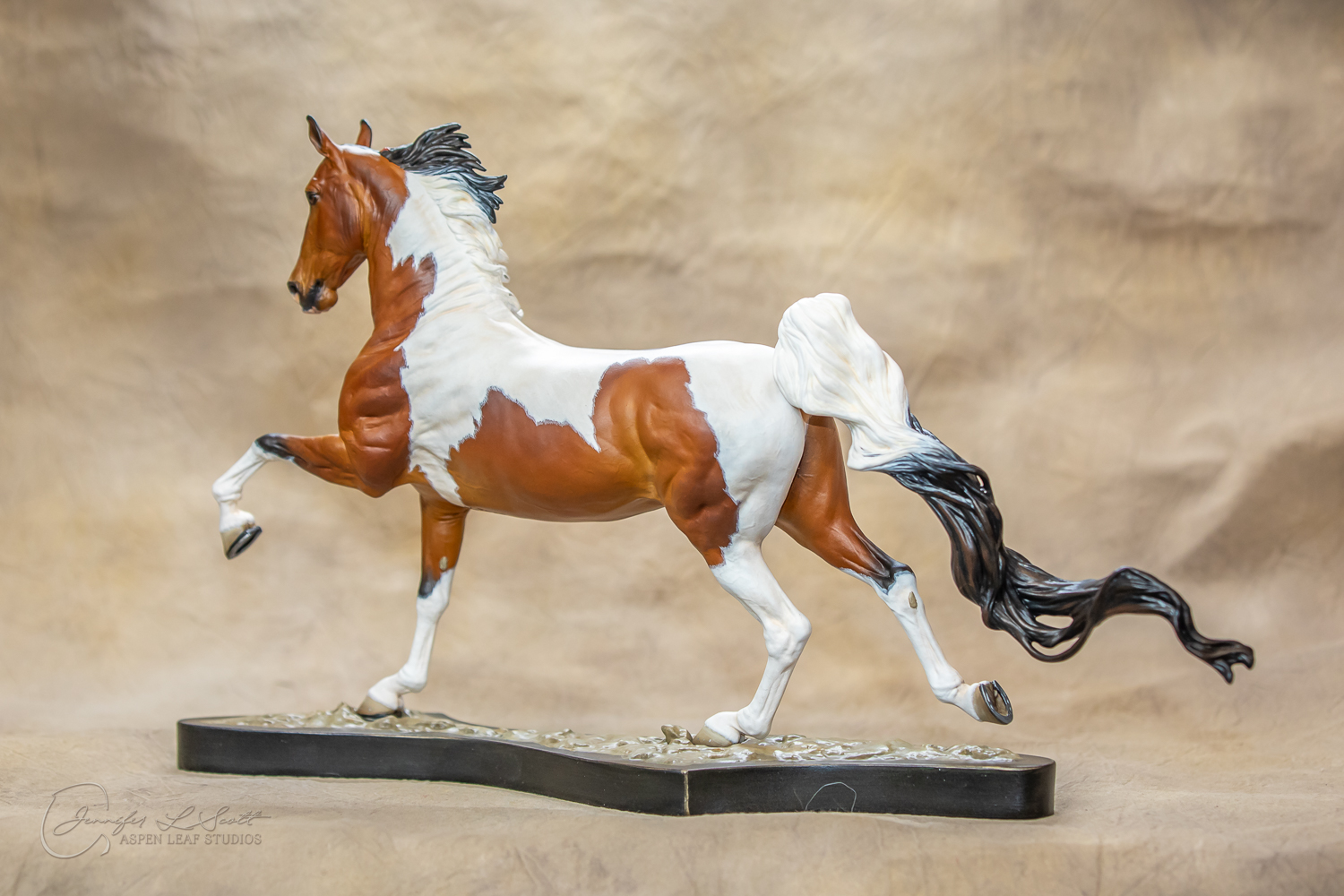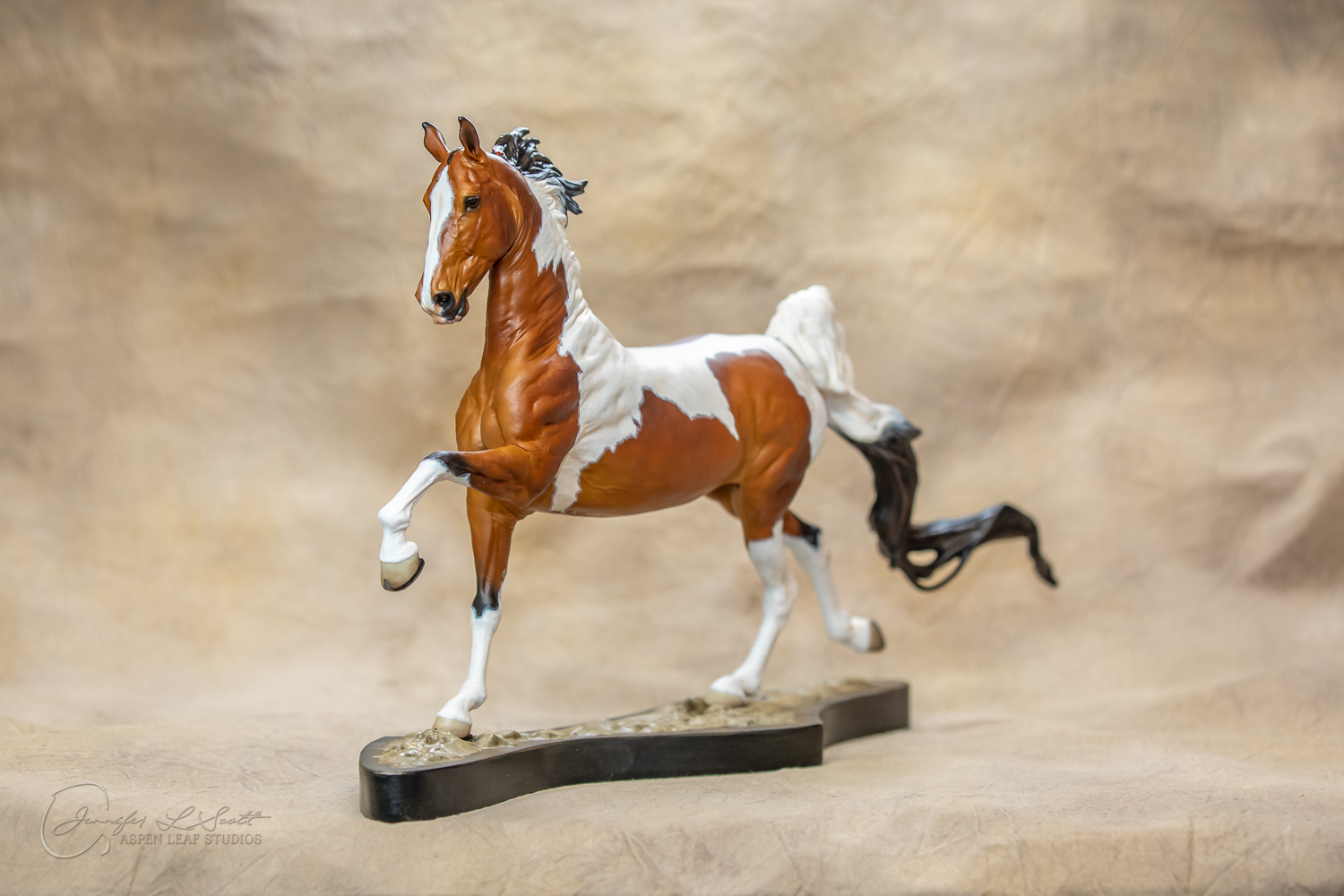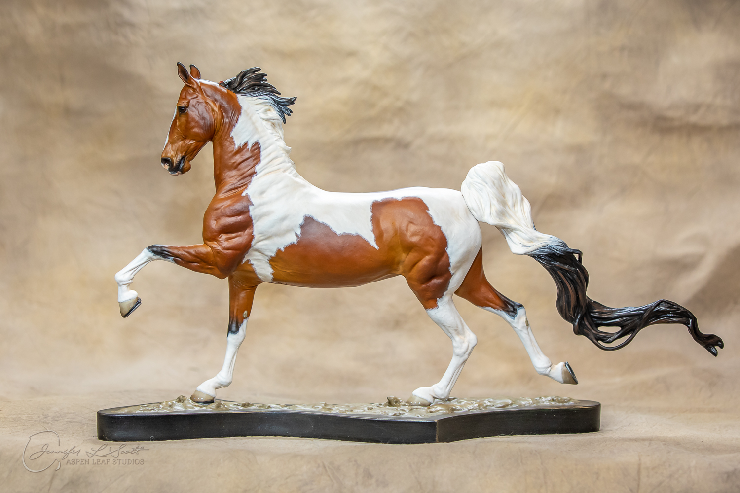 Painted bay tobiano with a traditional red ribbon in 2025. Base is dark olive with black antiquing and gold edging all surrounding a sand center.