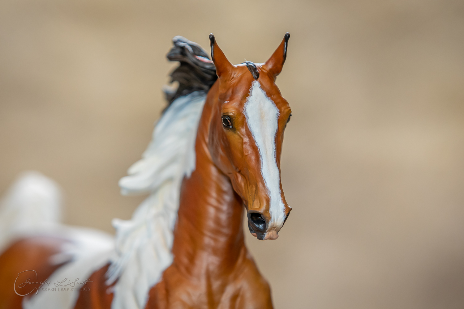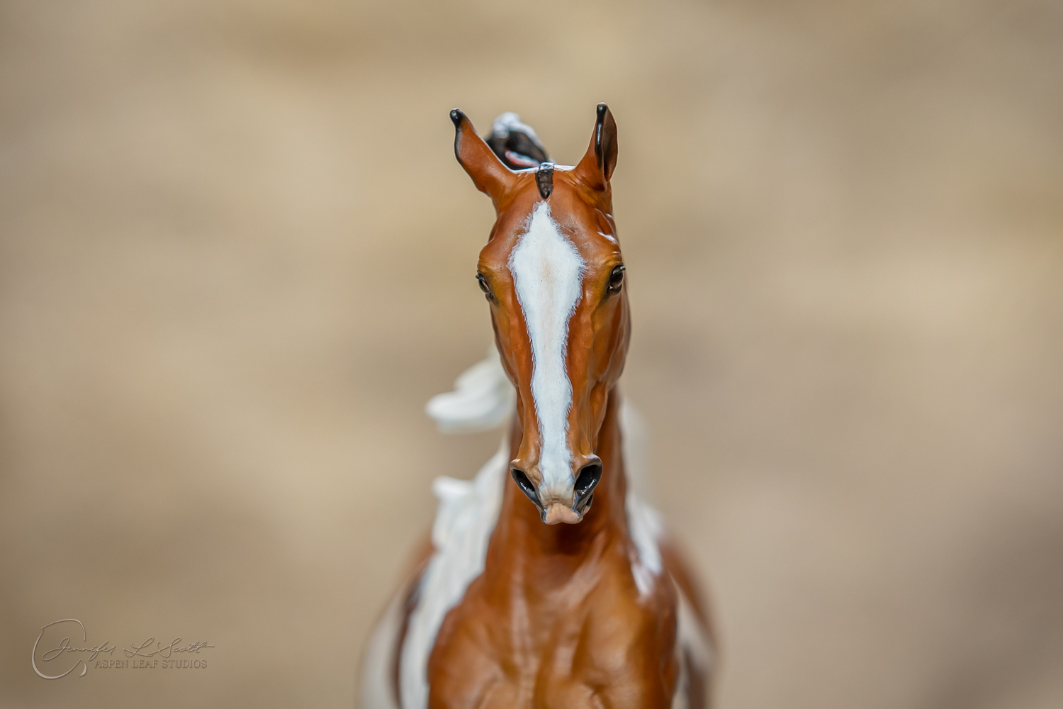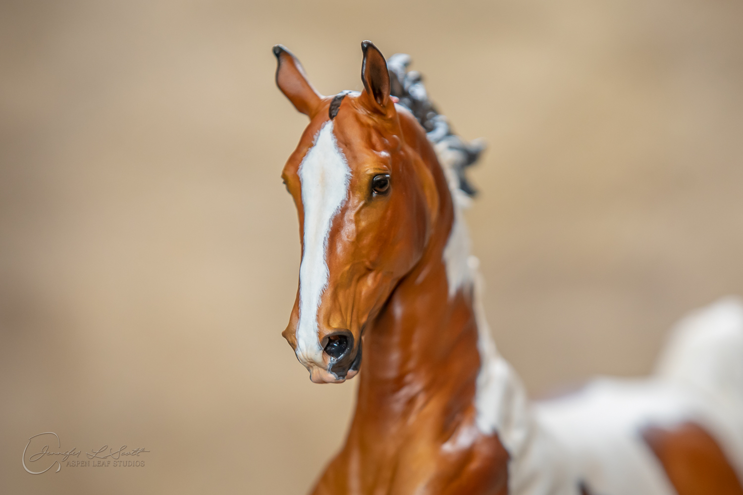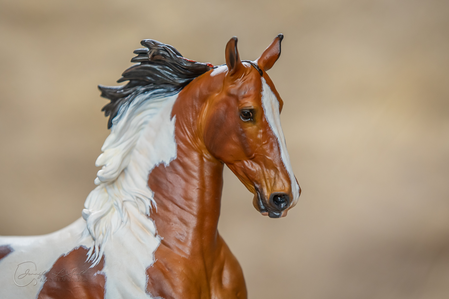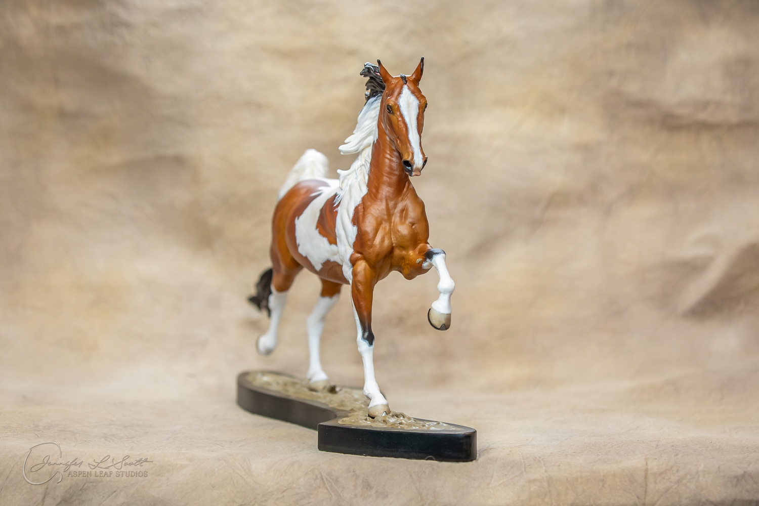 Painted bay tobiano with a traditional red ribbon in 2025. Base is dark olive with black antiquing and gold edging all surrounding a sand center.