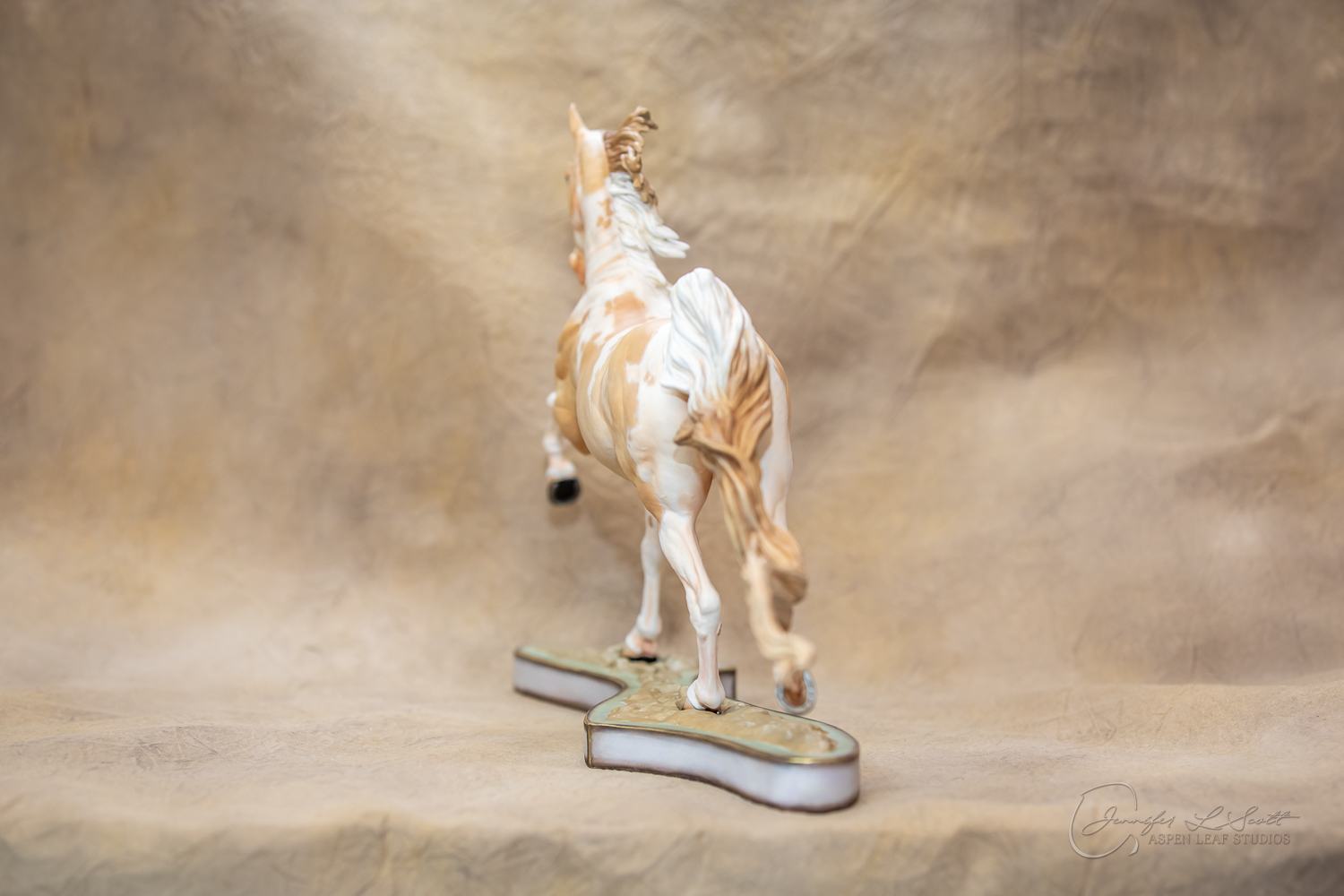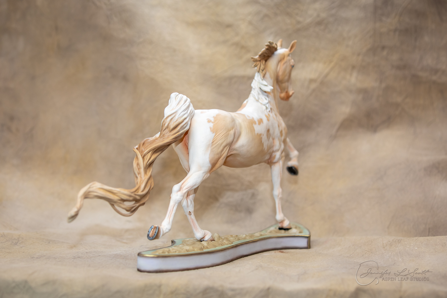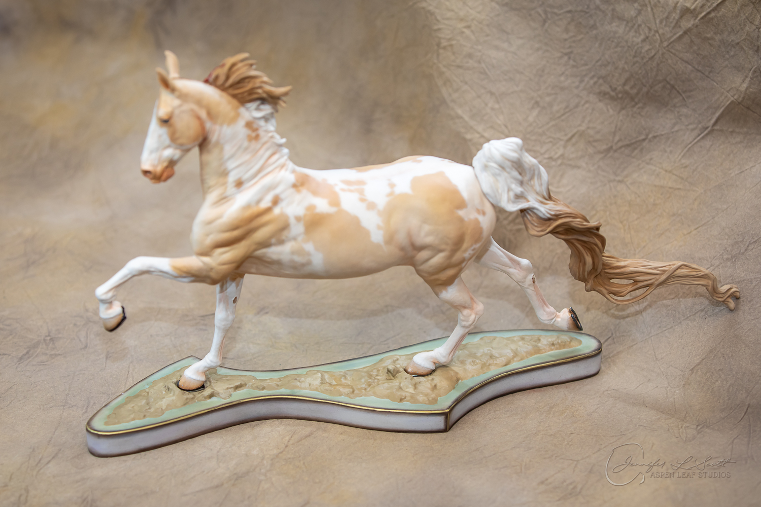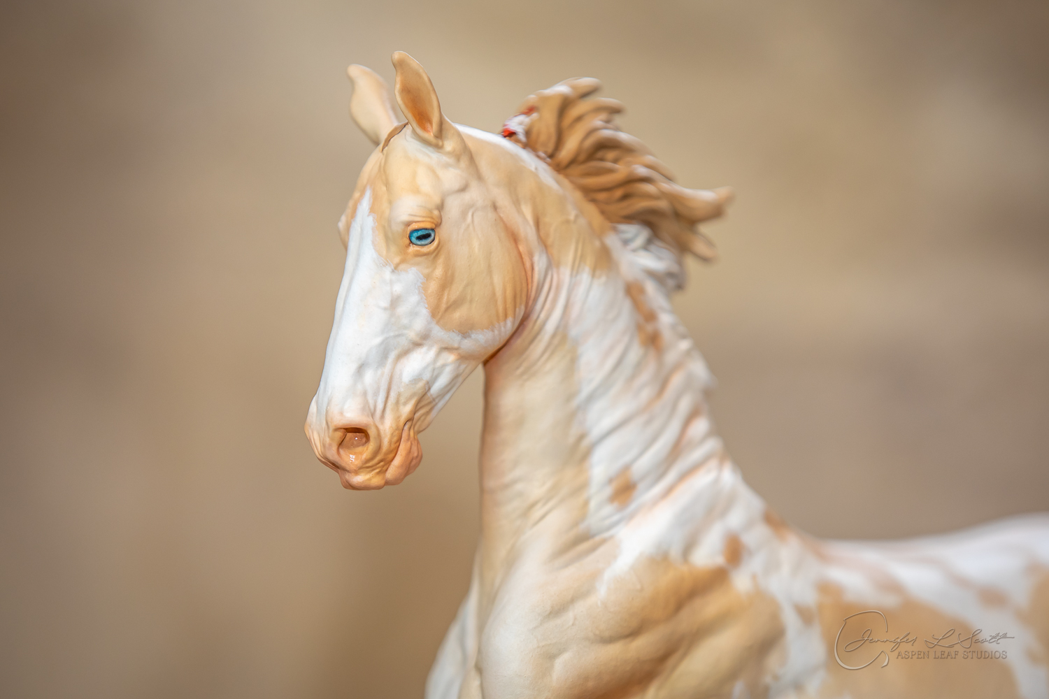 Painted perlino homozygous tobiano with a traditional red ribbon in 2025. Base is two-toned with violet-hued white sides and a pale warm green top, covered in brown antiquing with gold edging, all surrounding a sand center.