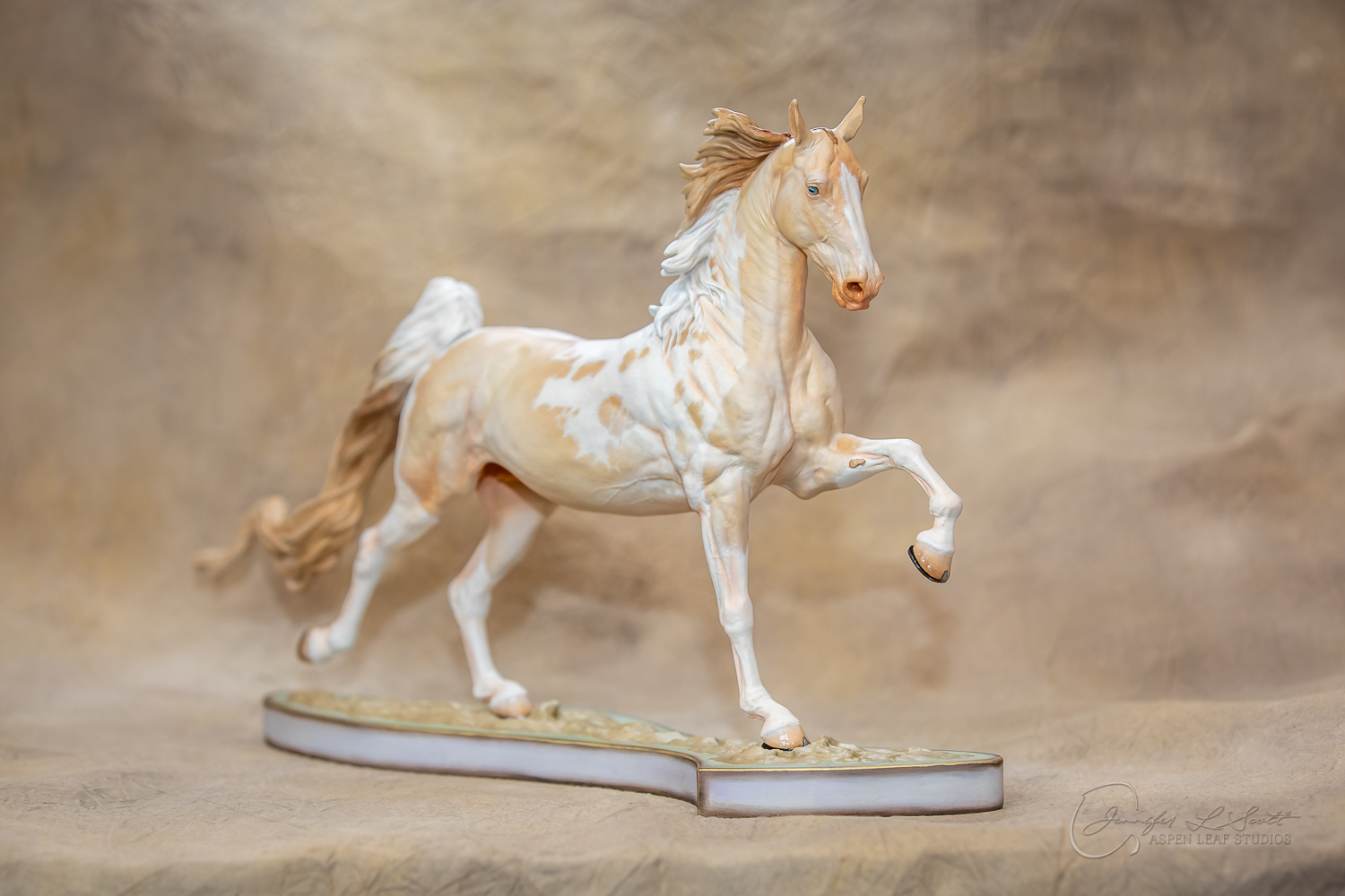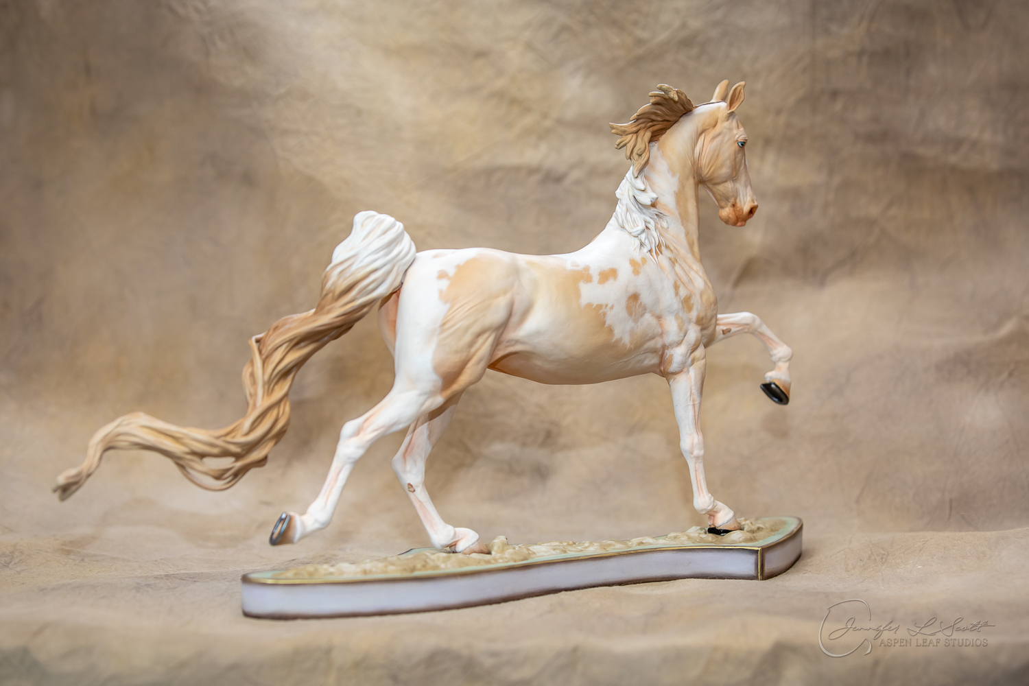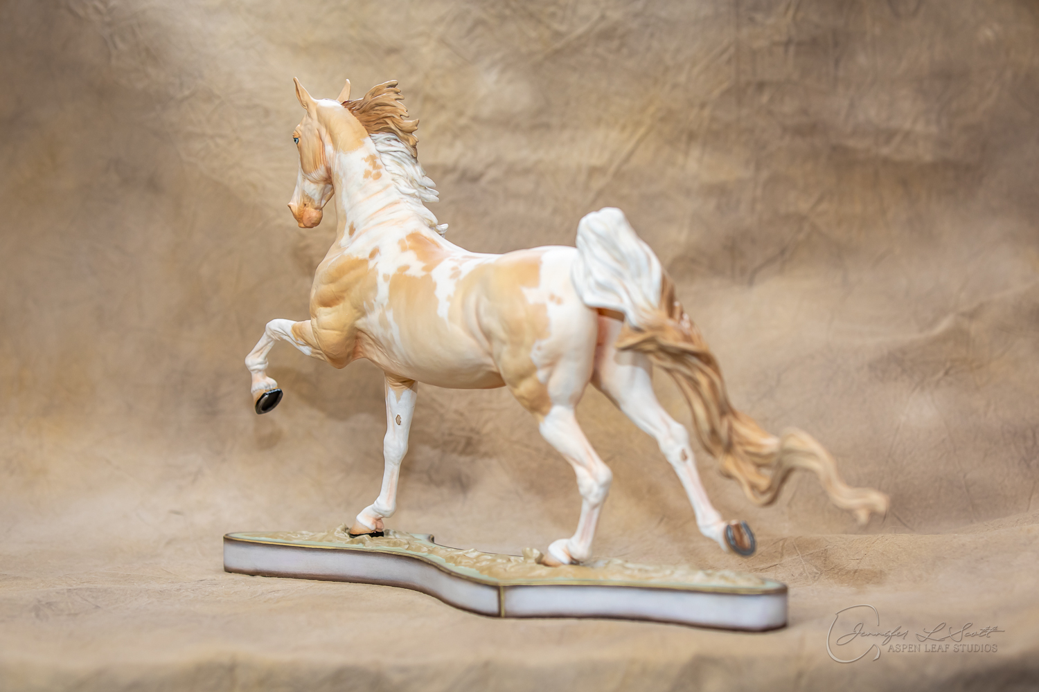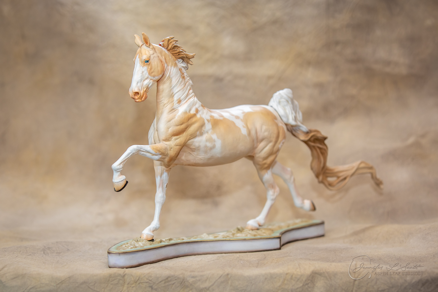 Painted perlino homozygous tobiano with a traditional red ribbon in 2025. Base is two-toned with violet-hued white sides and a pale warm green top, covered in brown antiquing with gold edging, all surrounding a sand center.