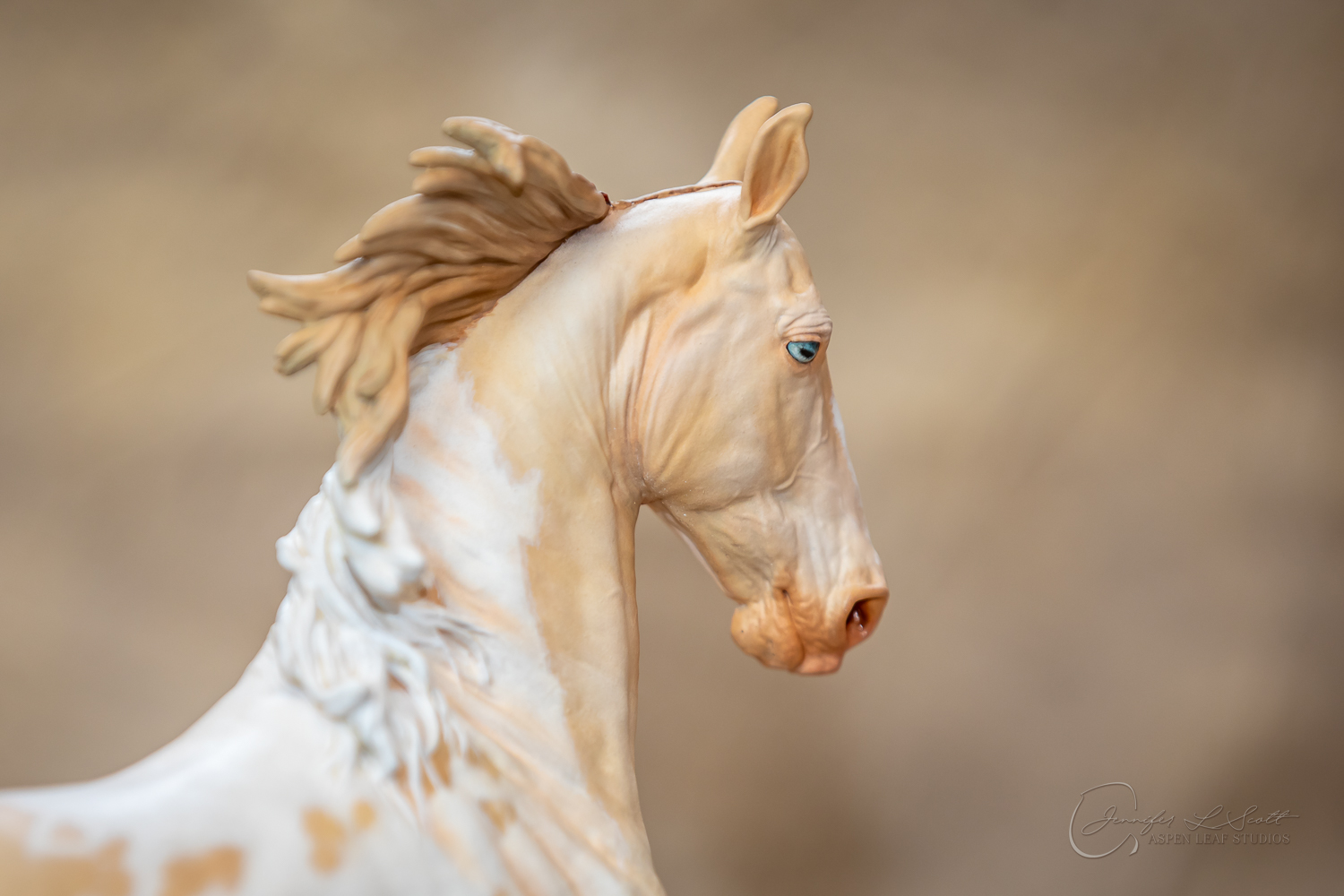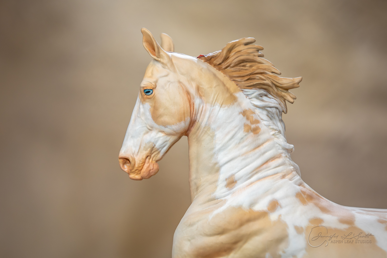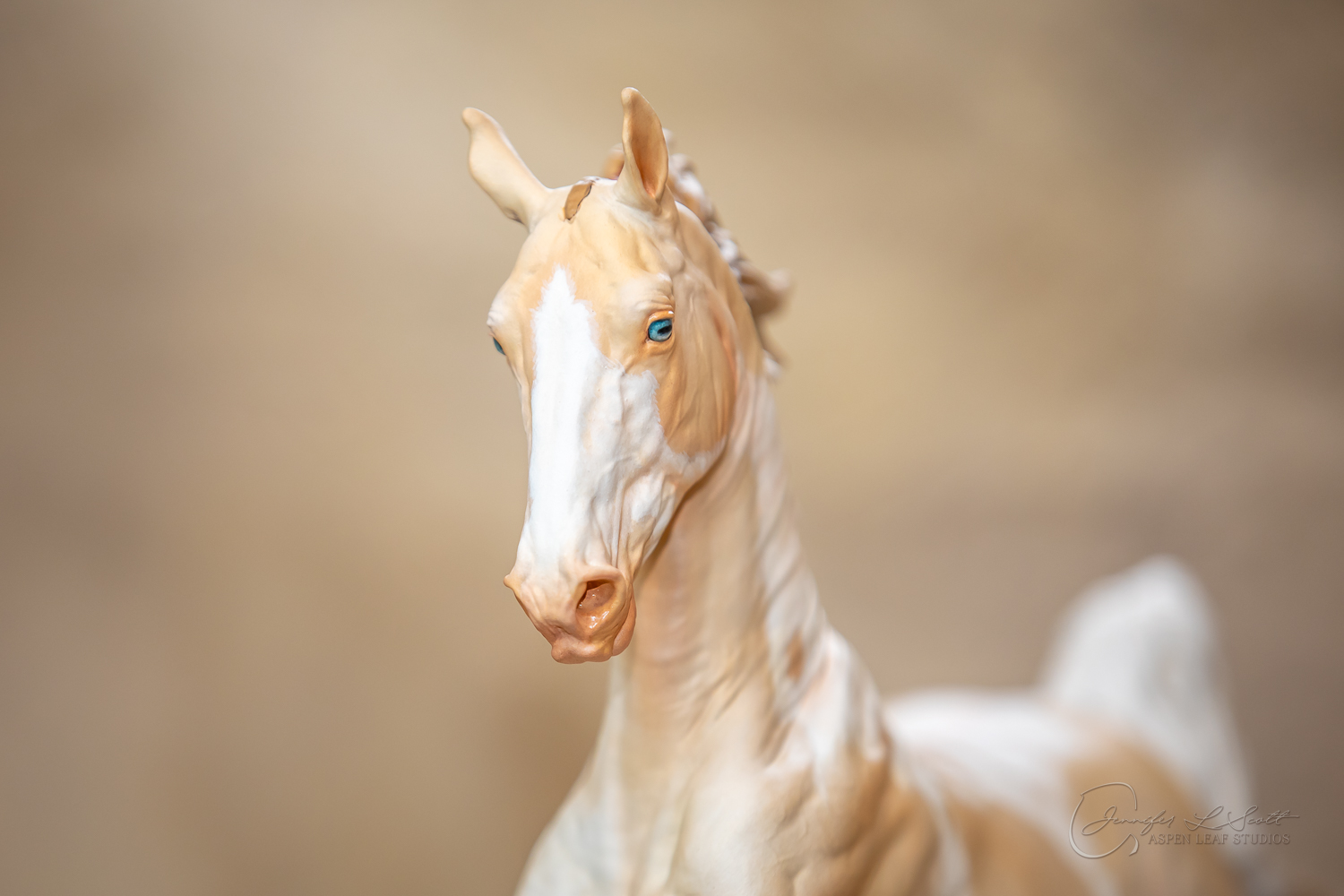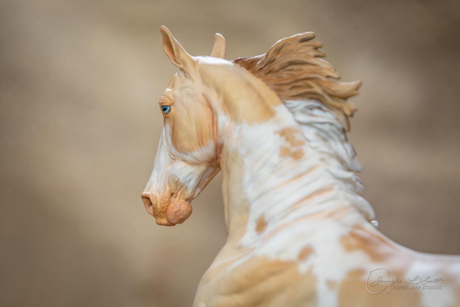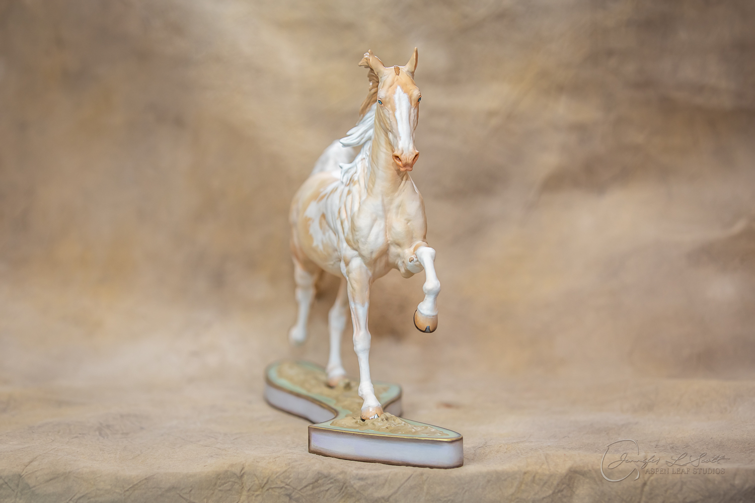 Painted perlino homozygous tobiano with a traditional red ribbon in 2025. Base is two-toned with violet-hued white sides and a pale warm green top, covered in brown antiquing with gold edging, all surrounding a sand center.