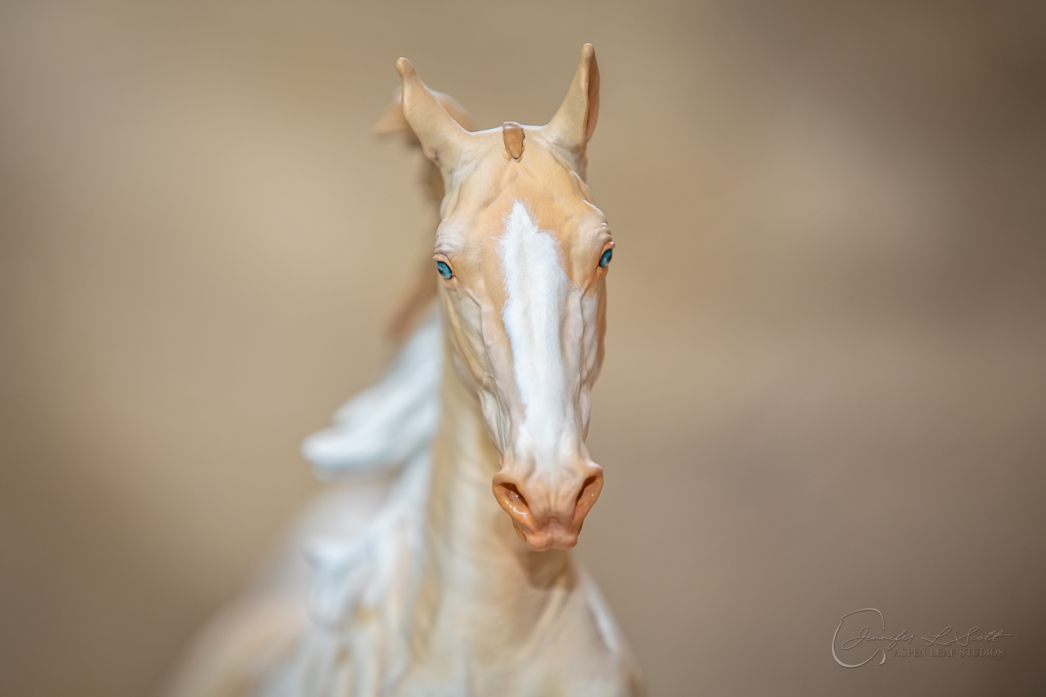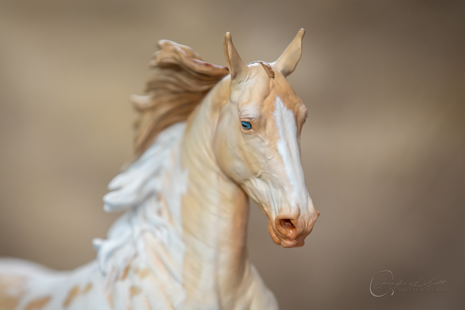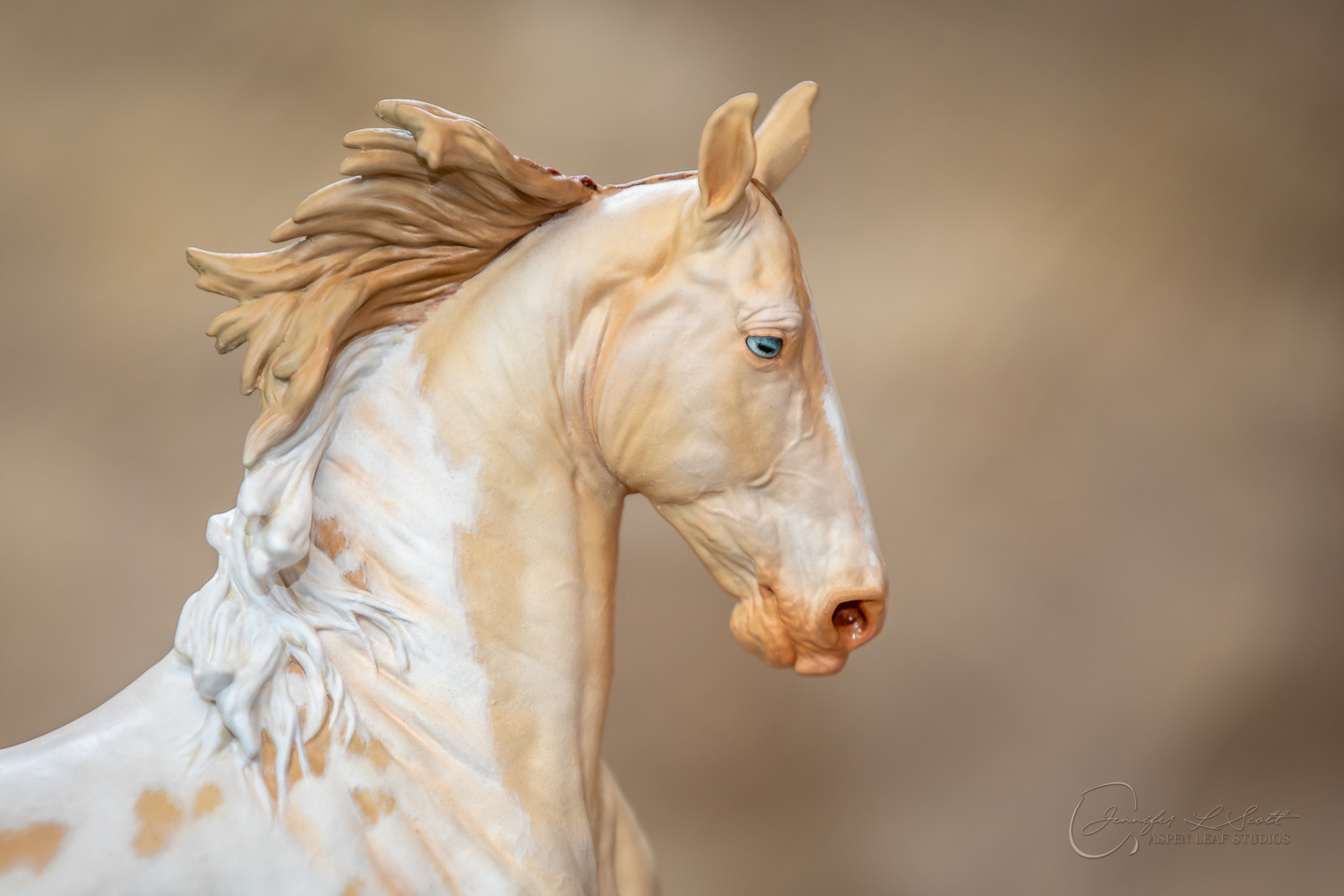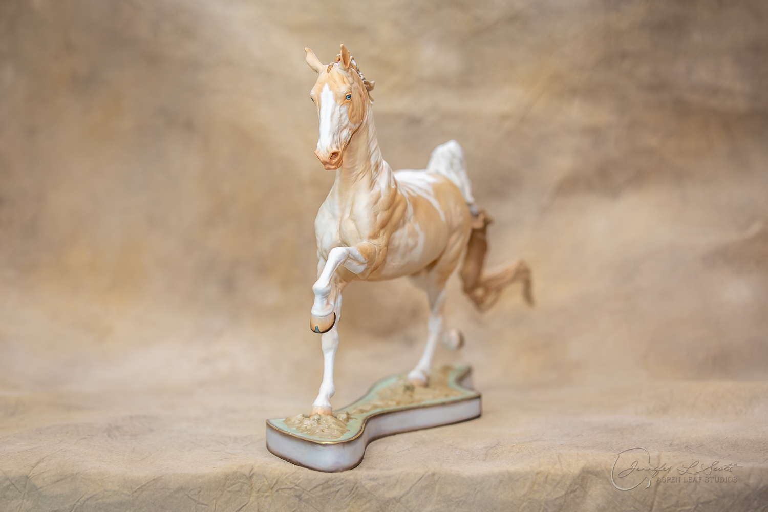 Painted perlino homozygous tobiano with a traditional red ribbon in 2025. Base is two-toned with violet-hued white sides and a pale warm green top, covered in brown antiquing with gold edging, all surrounding a sand center.