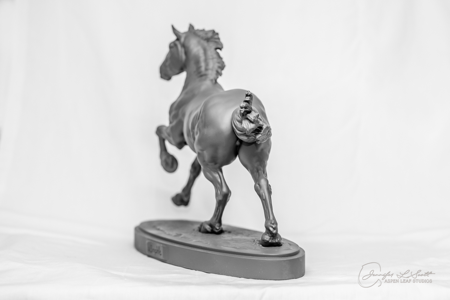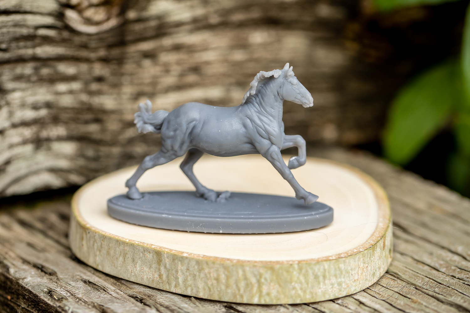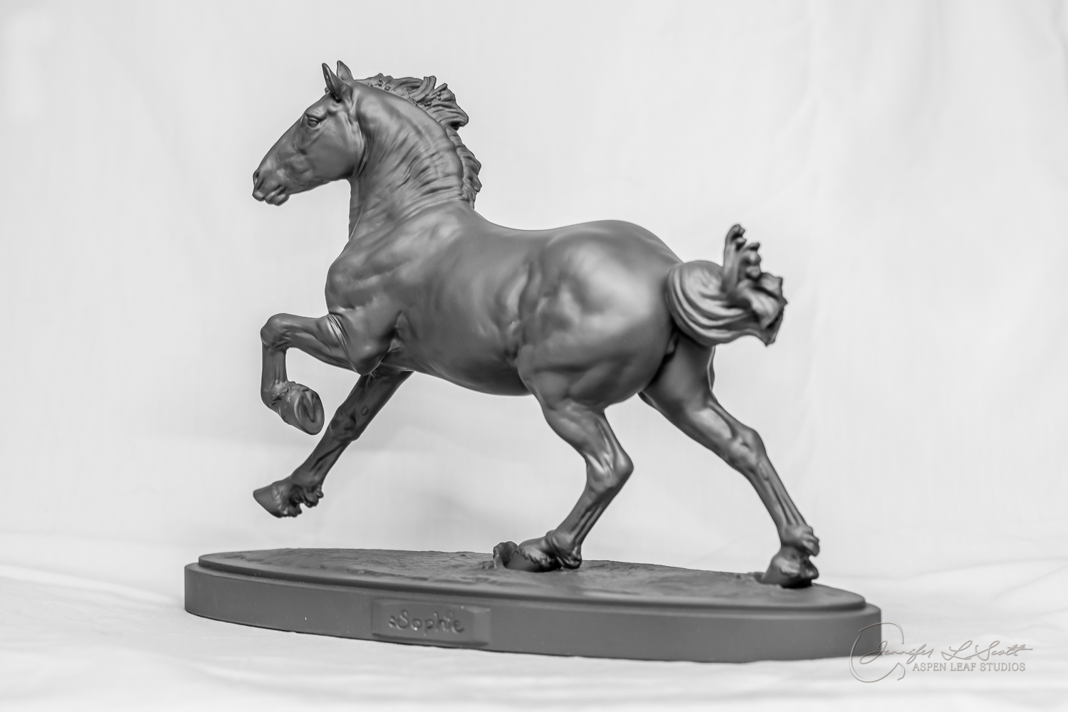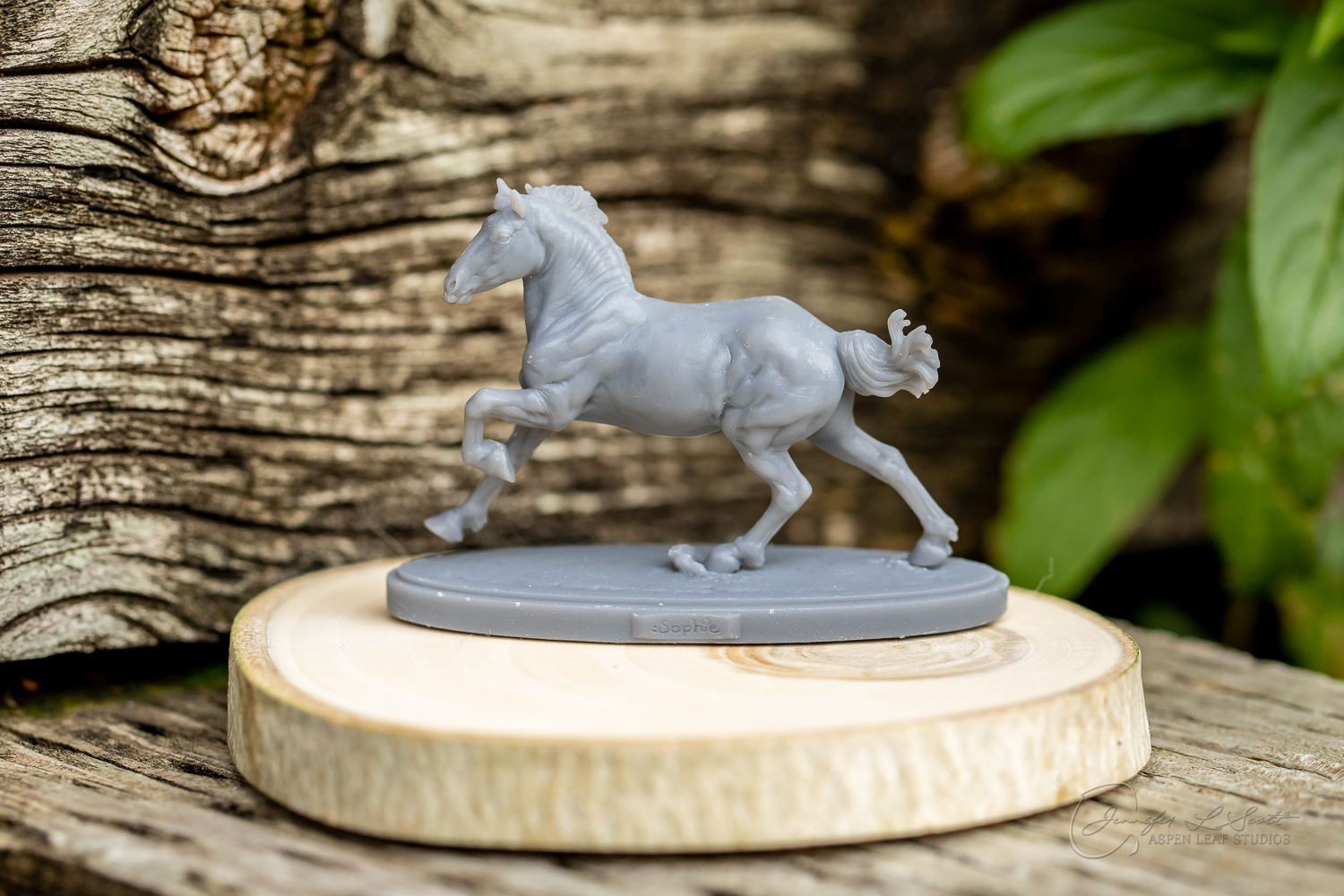 Sophie's classic scale is solid-cast resin with steel wire reinforcements in his legs produced in house. Her base is also solid cast and both of her back hooves as well as their insert locations in the base are magnetic for a secure fit. She measures approximately 7.5" high by 9.5" long with an ovular base of around 4" wide by 11" long and nearly 1" high in places. The micro piece is 3D-printed and stands roughly 1.8" tall and has undergone file modification for perfection of details and durability in this impossibly tiny scale. Both scales were produced in house.