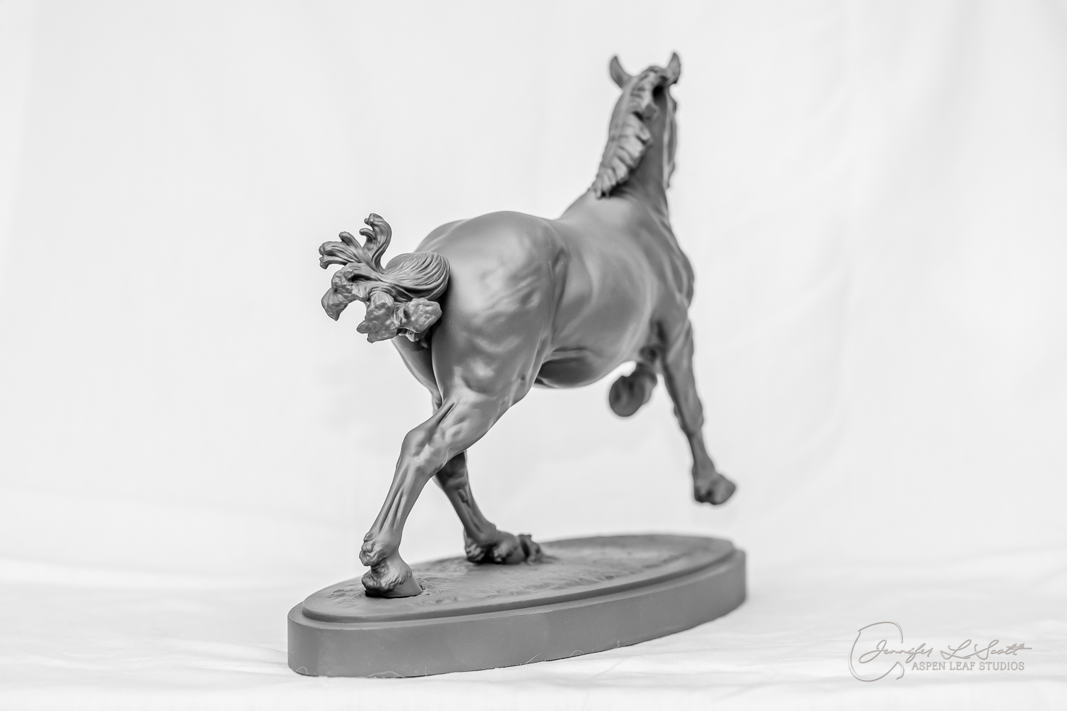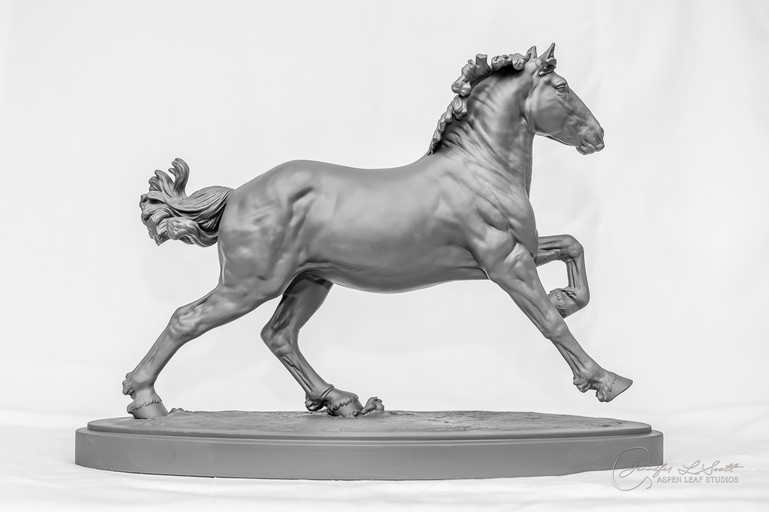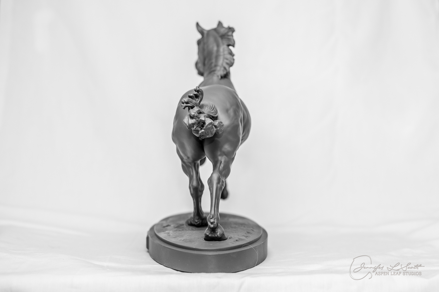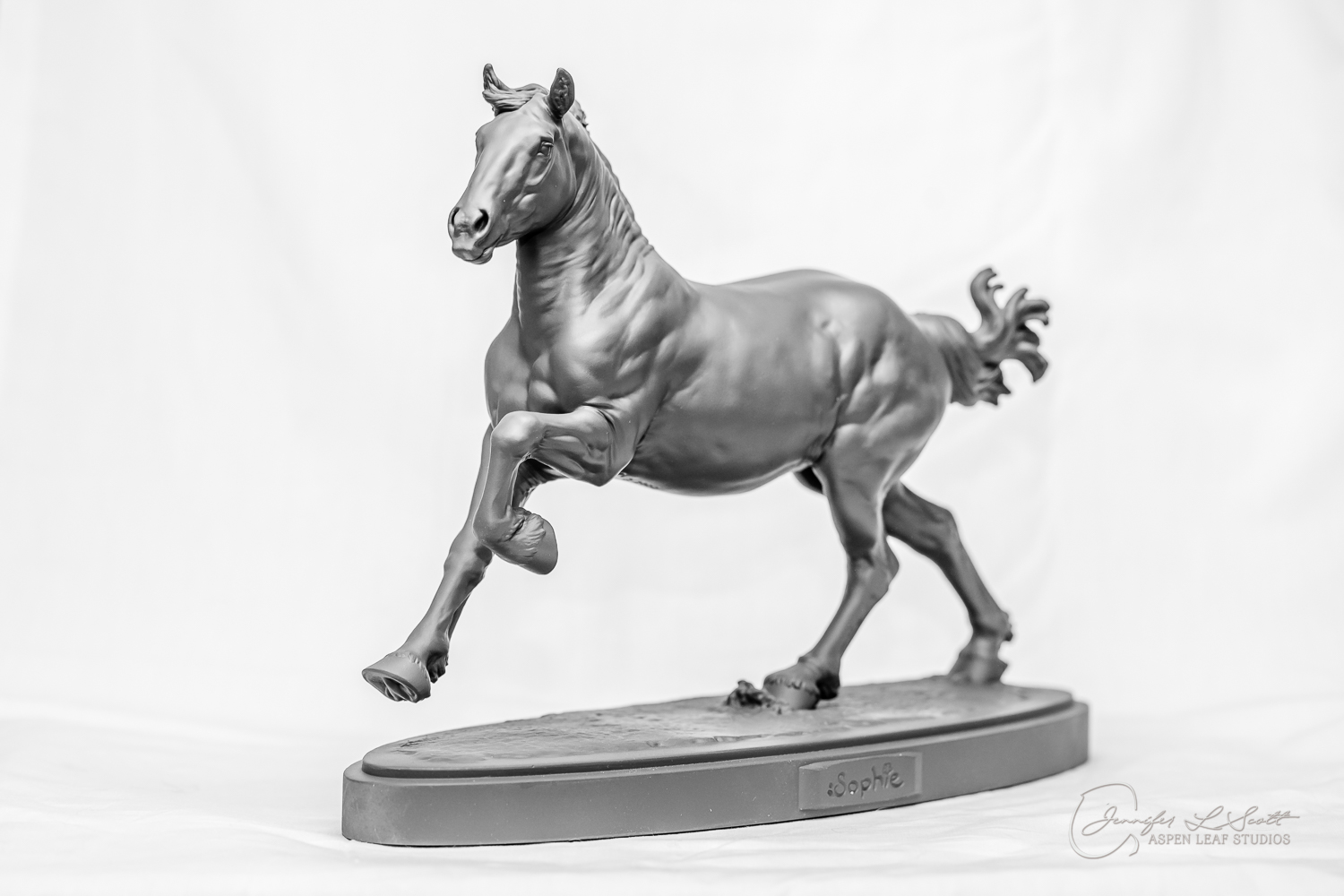 Sophie's classic scale is solid-cast resin with steel wire reinforcements in his legs produced in house. Her base is also solid cast and both of her back hooves as well as their insert locations in the base are magnetic for a secure fit. She measures approximately 7.5" high by 9.5" long with an ovular base of around 4" wide by 11" long and nearly 1" high in places. The micro piece is 3D-printed and stands roughly 1.8" tall and has undergone file modification for perfection of details and durability in this impossibly tiny scale. Both scales were produced in house.