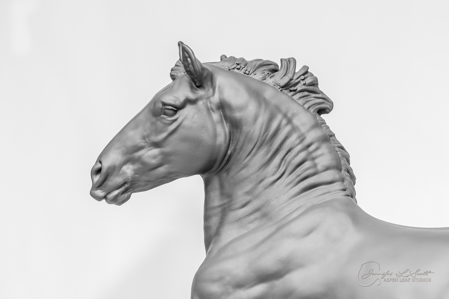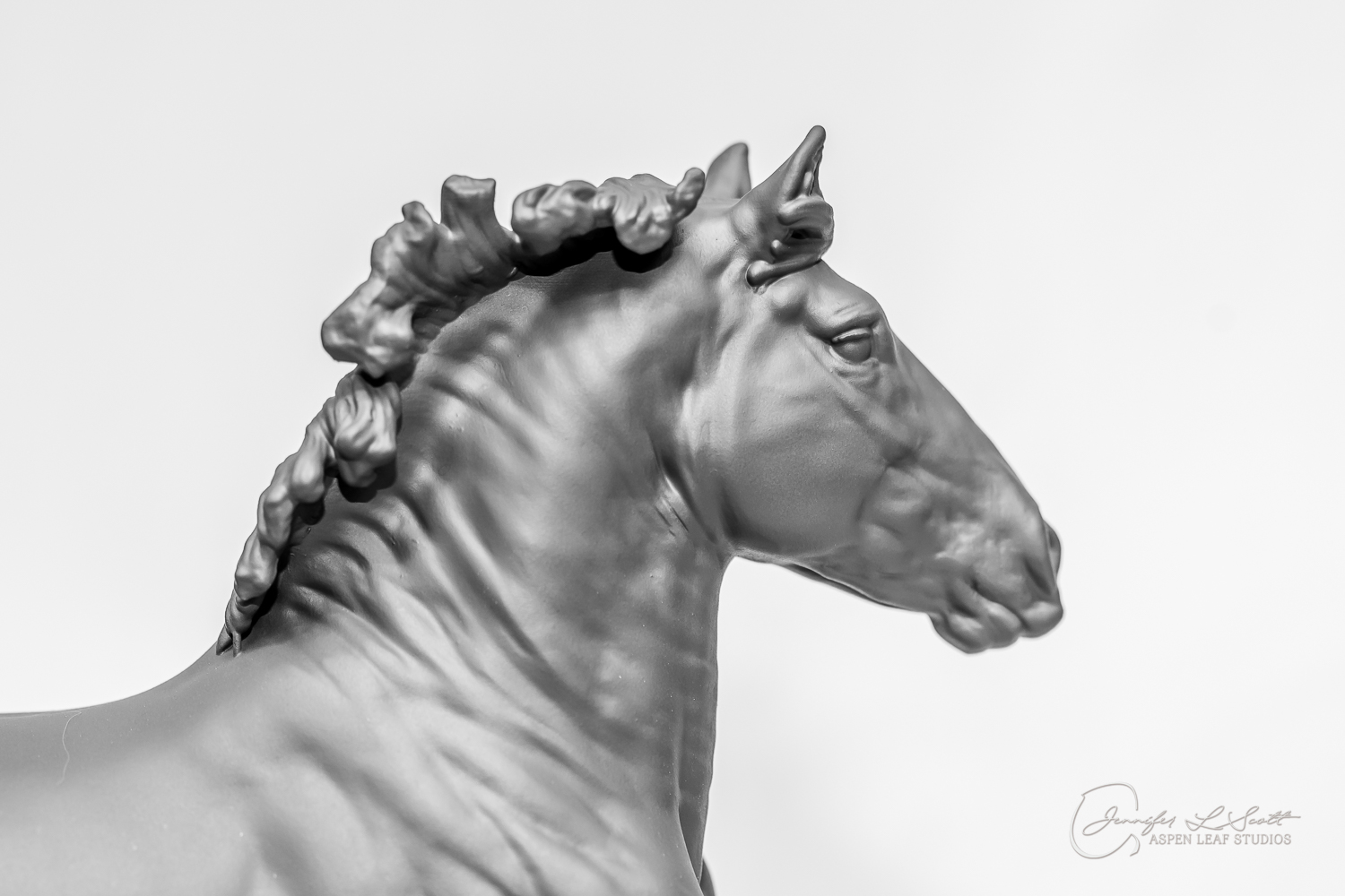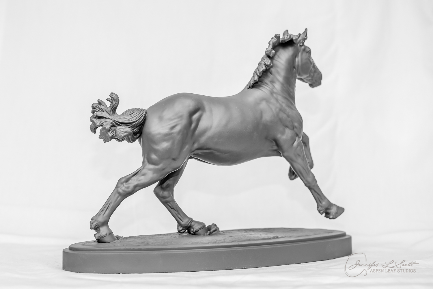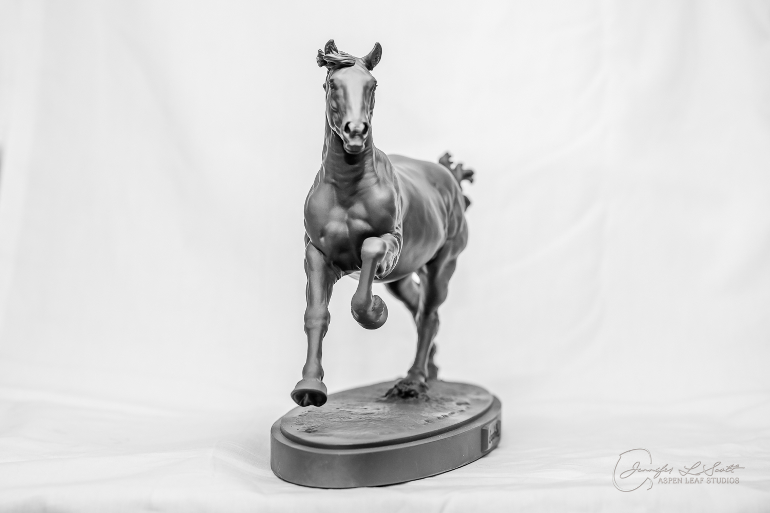 Sophie's classic scale is solid-cast resin with steel wire reinforcements in his legs produced in house. Her base is also solid cast and both of her back hooves as well as their insert locations in the base are magnetic for a secure fit. She measures approximately 7.5" high by 9.5" long with an ovular base of around 4" wide by 11" long and nearly 1" high in places. The micro piece is 3D-printed and stands roughly 1.8" tall and has undergone file modification for perfection of details and durability in this impossibly tiny scale. Both scales were produced in house.