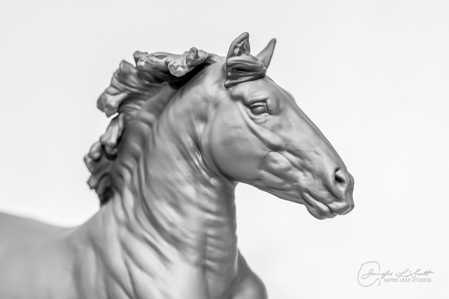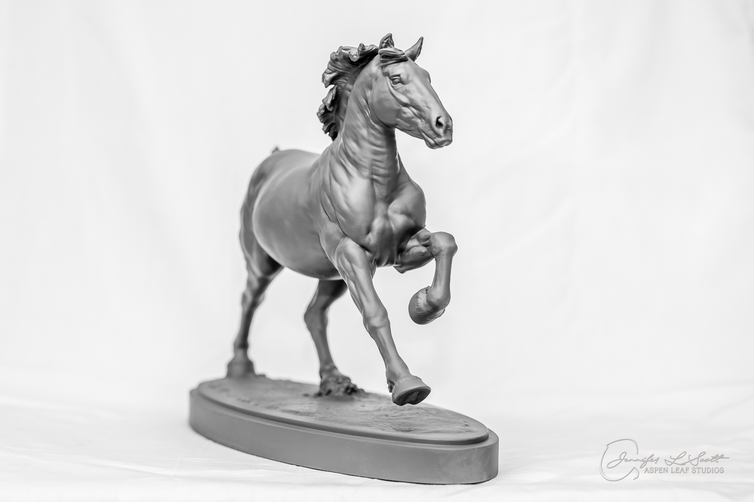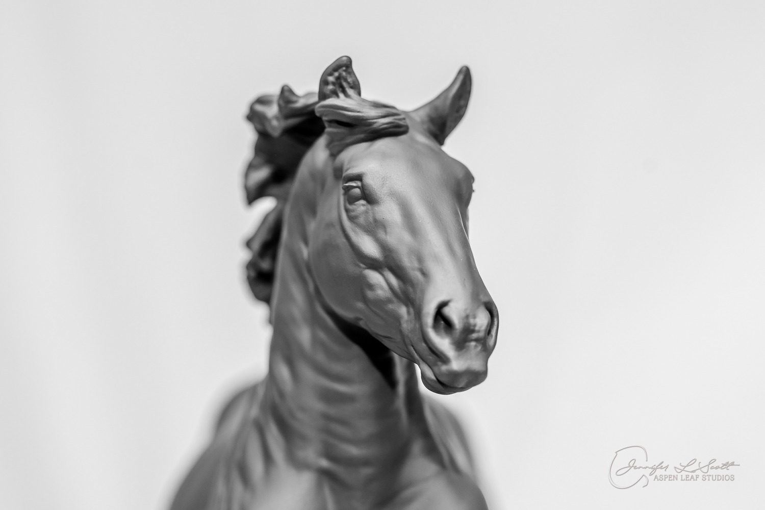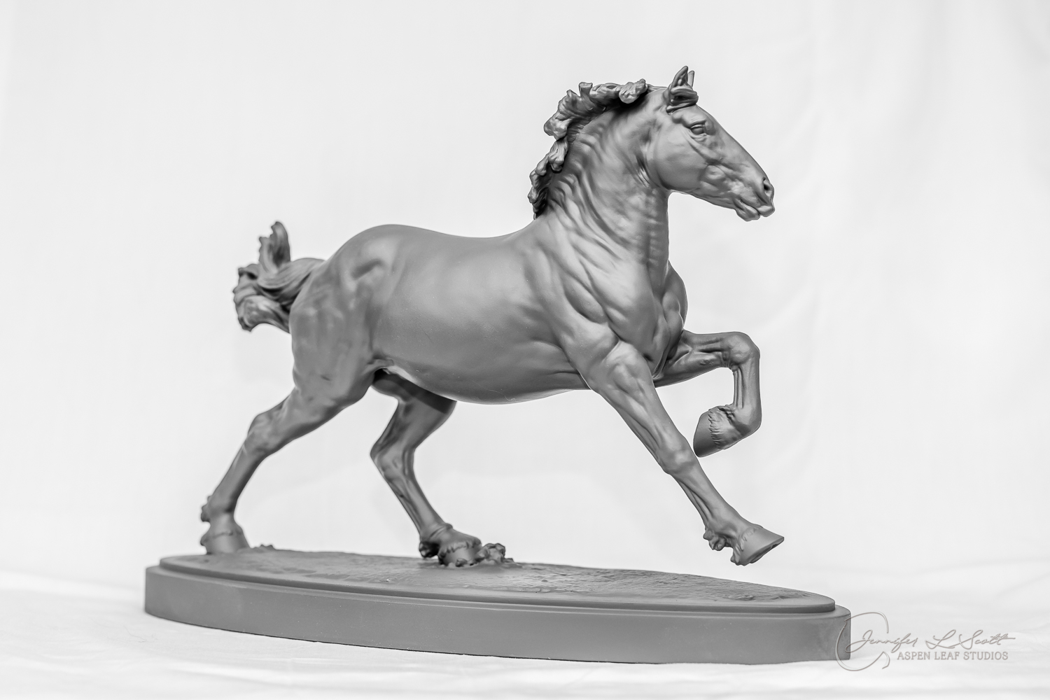 Sophie's classic scale is solid-cast resin with steel wire reinforcements in his legs produced in house. Her base is also solid cast and both of her back hooves as well as their insert locations in the base are magnetic for a secure fit. She measures approximately 7.5" high by 9.5" long with an ovular base of around 4" wide by 11" long and nearly 1" high in places. The micro piece is 3D-printed and stands roughly 1.8" tall and has undergone file modification for perfection of details and durability in this impossibly tiny scale. Both scales were produced in house.