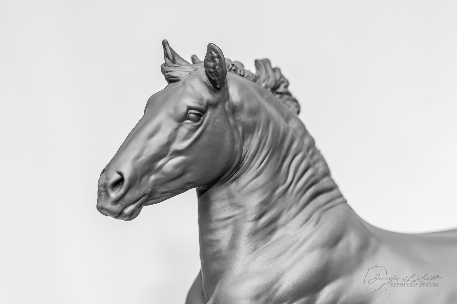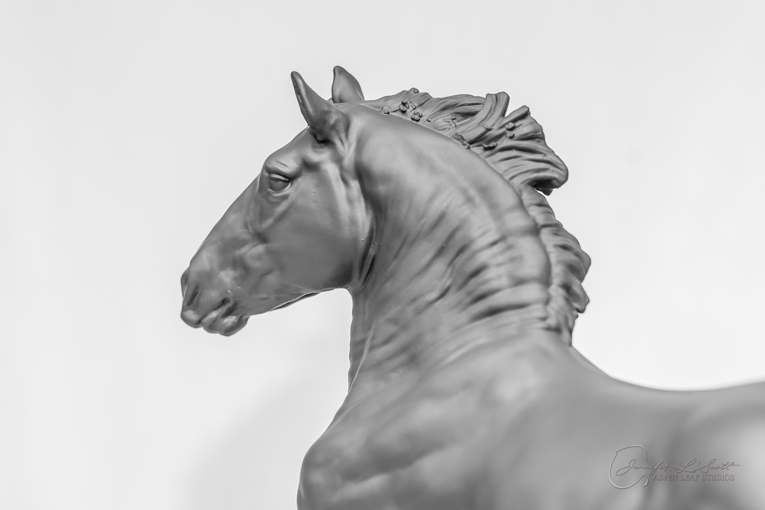 Sophie is a super playful galavanting grade mare who more than likely has some draft in there somewhere. For cuteness and femininity, I added some daisy chains woven into the front half of her mane. The strands are unraveling and falling out as she runs. She was released during BreyerFest 2022 as a "mystery" piece, meaning know one knew what she looked like, only that I would have a new piece offered at my table. I had such a pleasure dealing with the classic scale version of Jorts, that I released Sophie in that scale as well as micro. Her micro form was offered as part of my random-draw mystery micro boxes at my BreyerFest 2022 table. Both pieces could only be obtained during Artisans' Gallery at BreyerFest 2022.