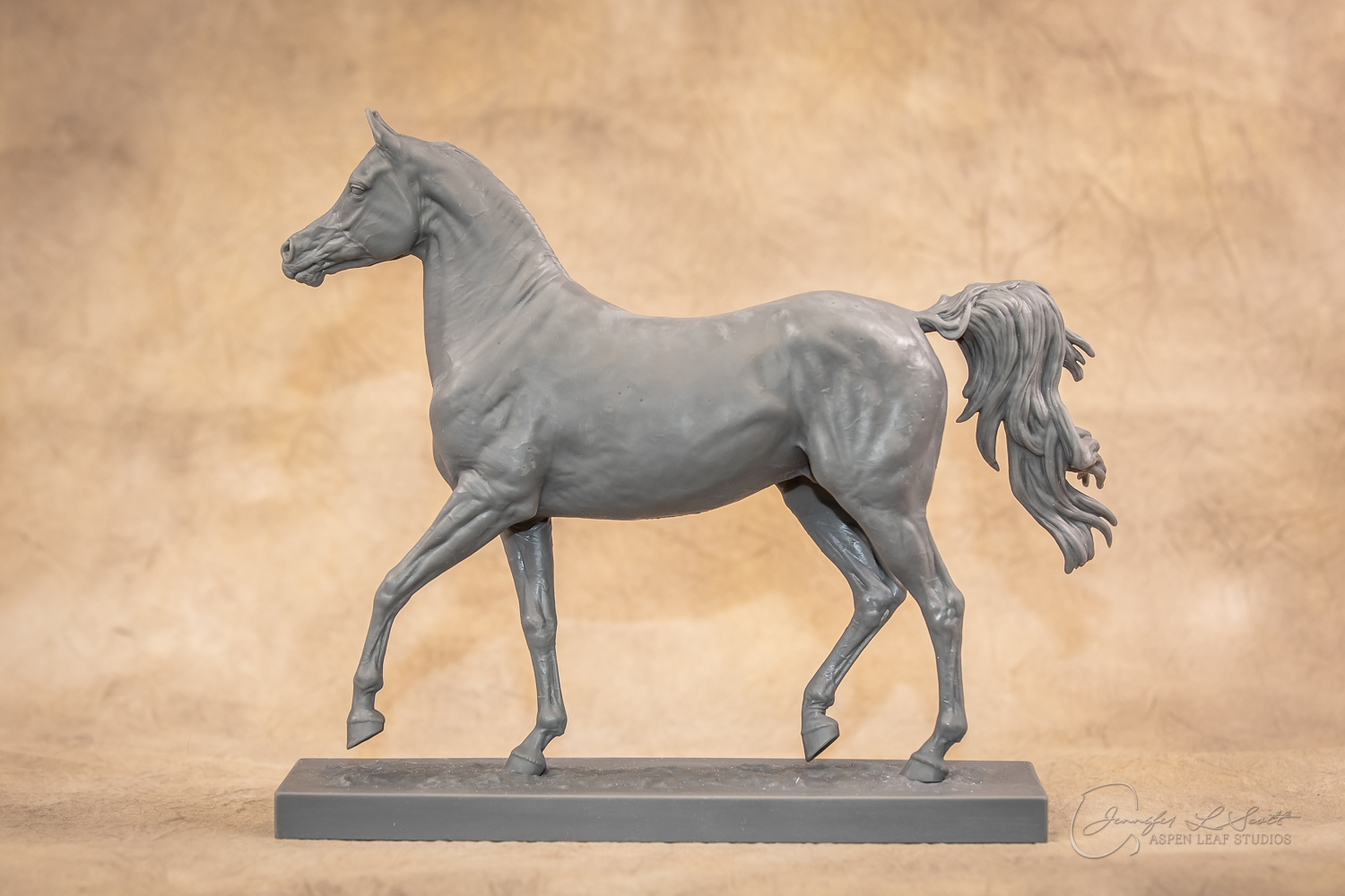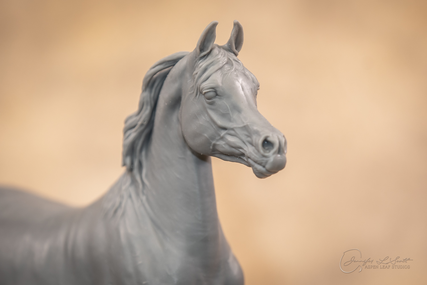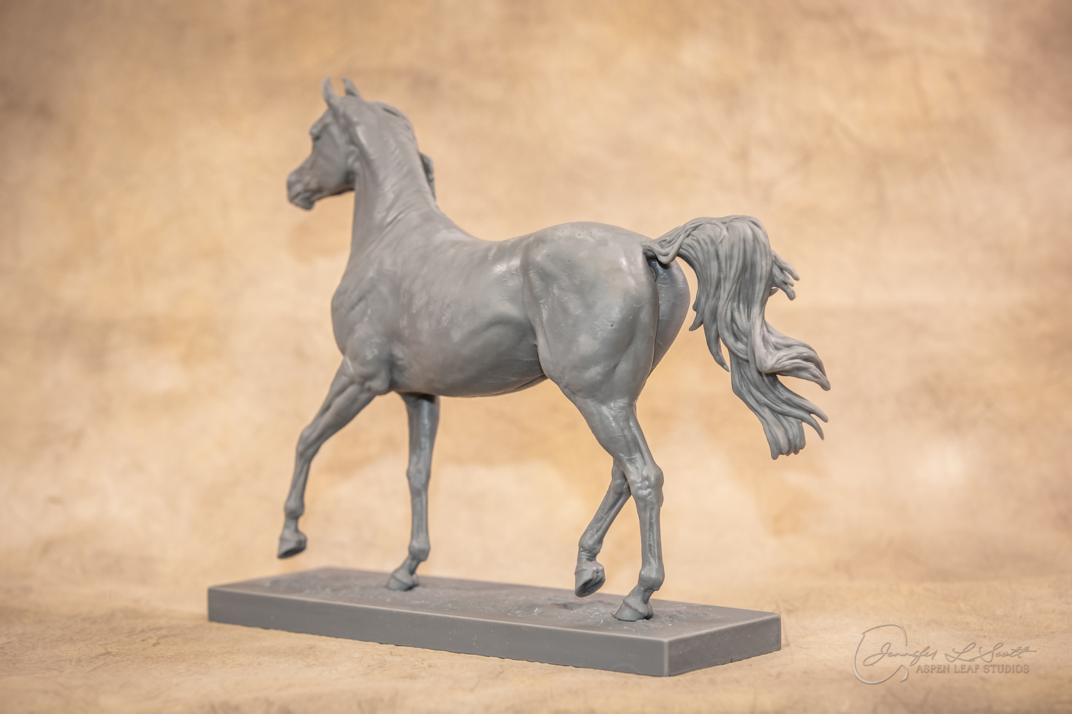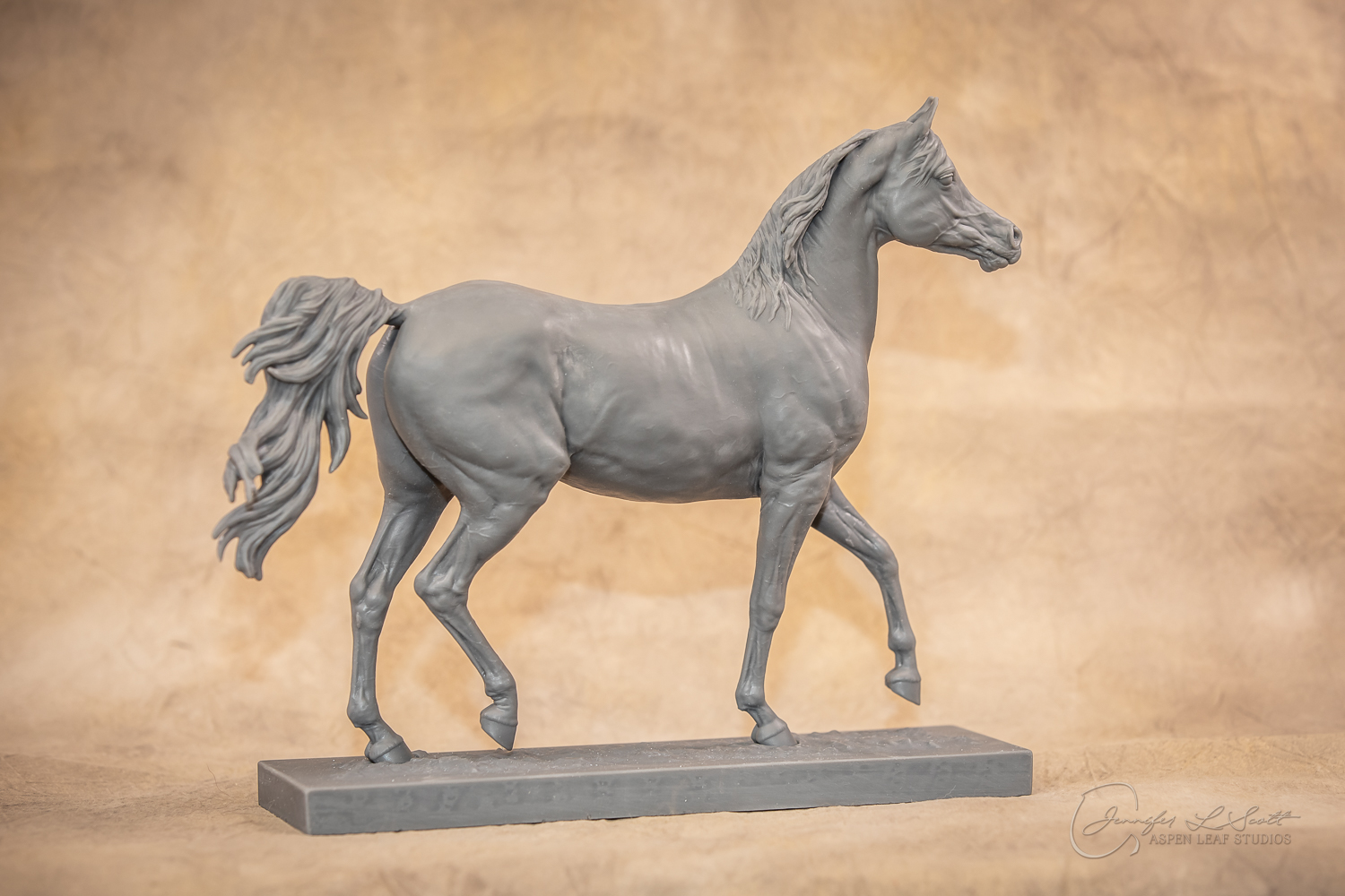 Talib (pronounced Tah-LEEB) is a plucky little (14 something hands high) representation of the Arabian. This sweet gelding is half-heartedly jigging /stepping towards something that's caught his attention. Perhaps his human has come to visit with treats? Because hims cute after all, and while clearly of good breeding this one is very much a pet. The most fun part of sculpting this piece was getting all that bendy Arabian movement. The nuances of gravity and weight shifts as he bends right, falling onto that inside shoulder. The step and support of the raised hip under his left hind and the drop of the opposite hip. The snakey-neck thing Arabians do. All of those shapes and details bring realism to this piece in ways that just sculpting pretty pieces can't. Then you add on that yummy texture and he's something that breathes. I'm so pleased with how he turned out.