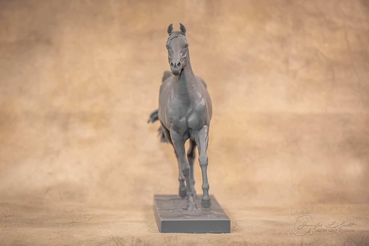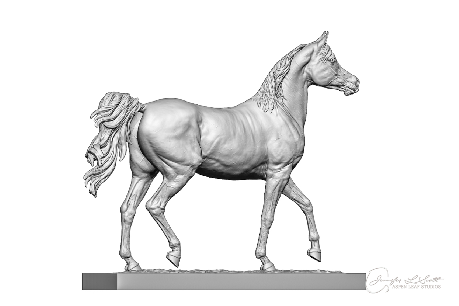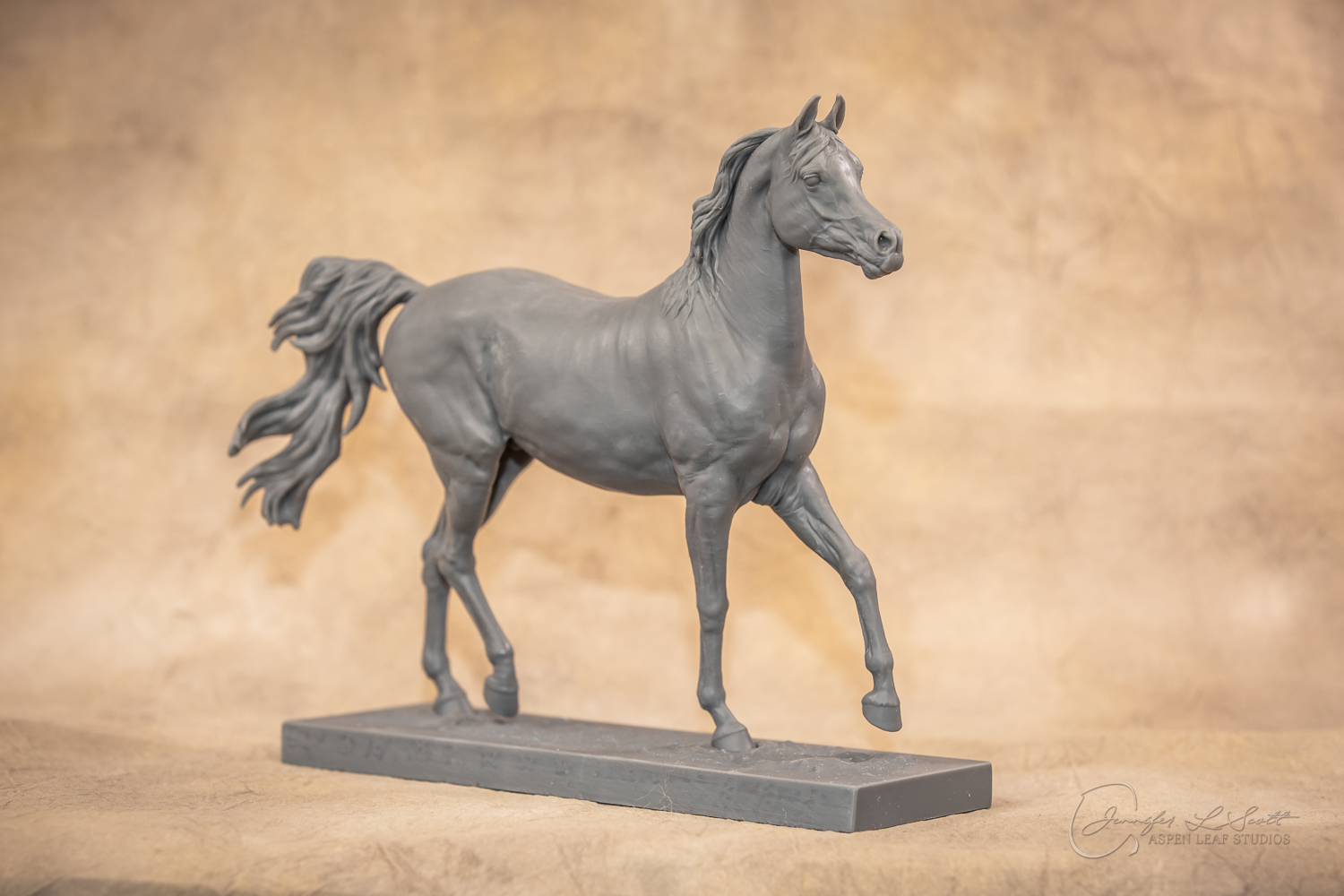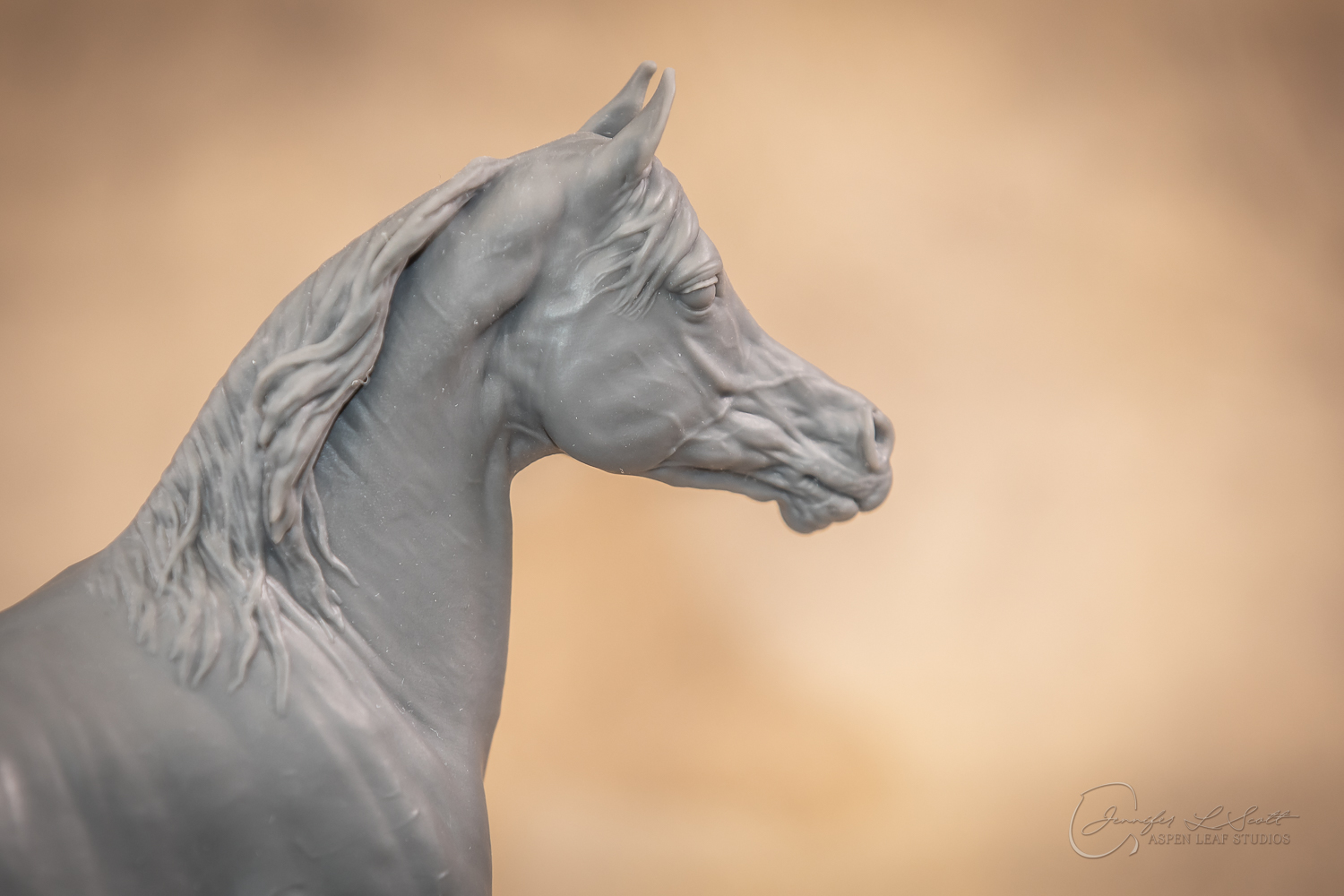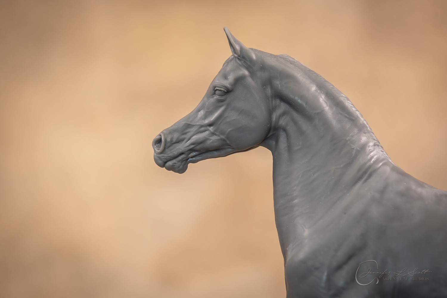 Talib (pronounced Tah-LEEB) is a plucky little (14 something hands high) representation of the Arabian. This sweet gelding is half-heartedly jigging /stepping towards something that's caught his attention. Perhaps his human has come to visit with treats? Because hims cute after all, and while clearly of good breeding this one is very much a pet. The most fun part of sculpting this piece was getting all that bendy Arabian movement. The nuances of gravity and weight shifts as he bends right, falling onto that inside shoulder. The step and support of the raised hip under his left hind and the drop of the opposite hip. The snakey-neck thing Arabians do. All of those shapes and details bring realism to this piece in ways that just sculpting pretty pieces can't. Then you add on that yummy texture and he's something that breathes. I'm so pleased with how he turned out.