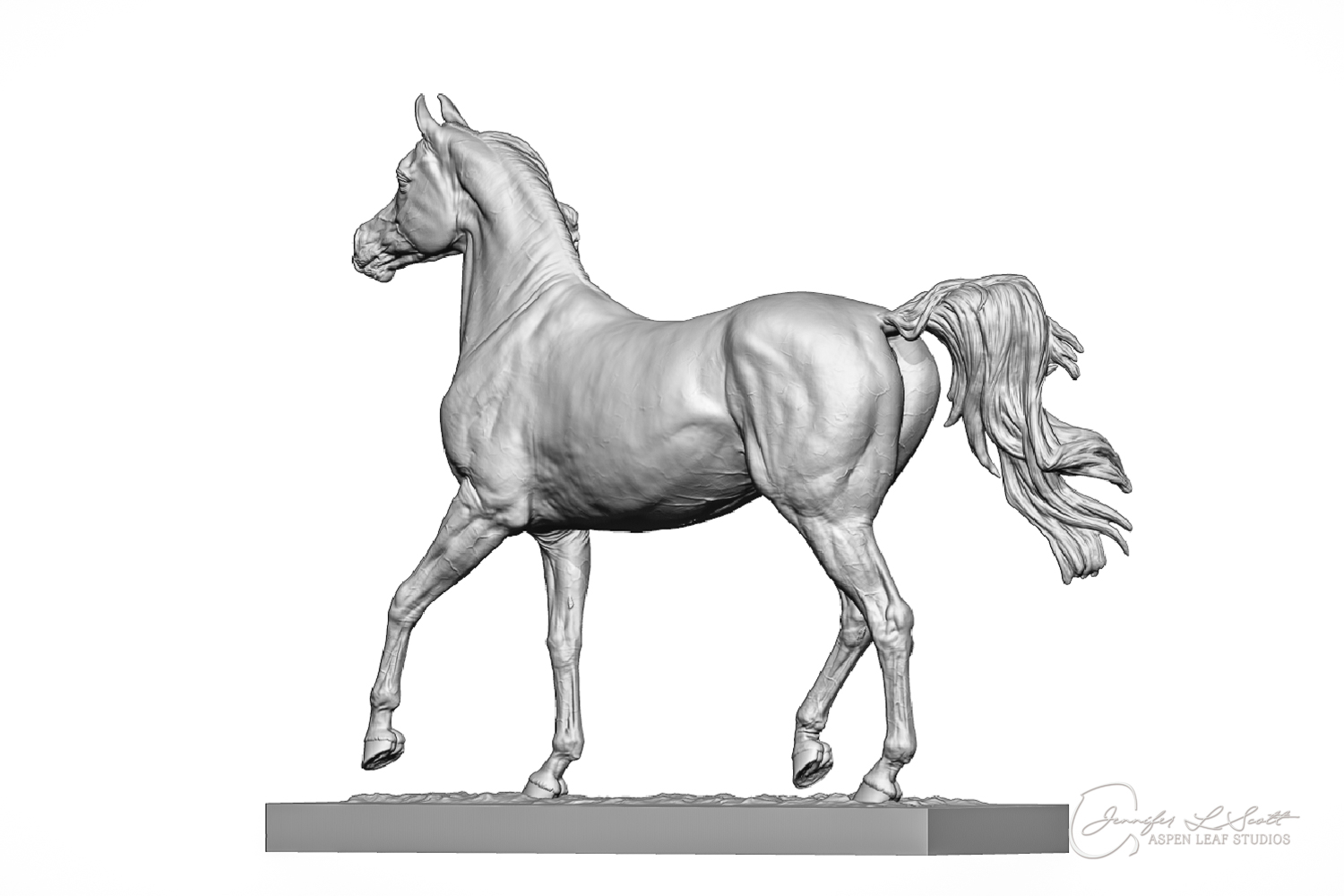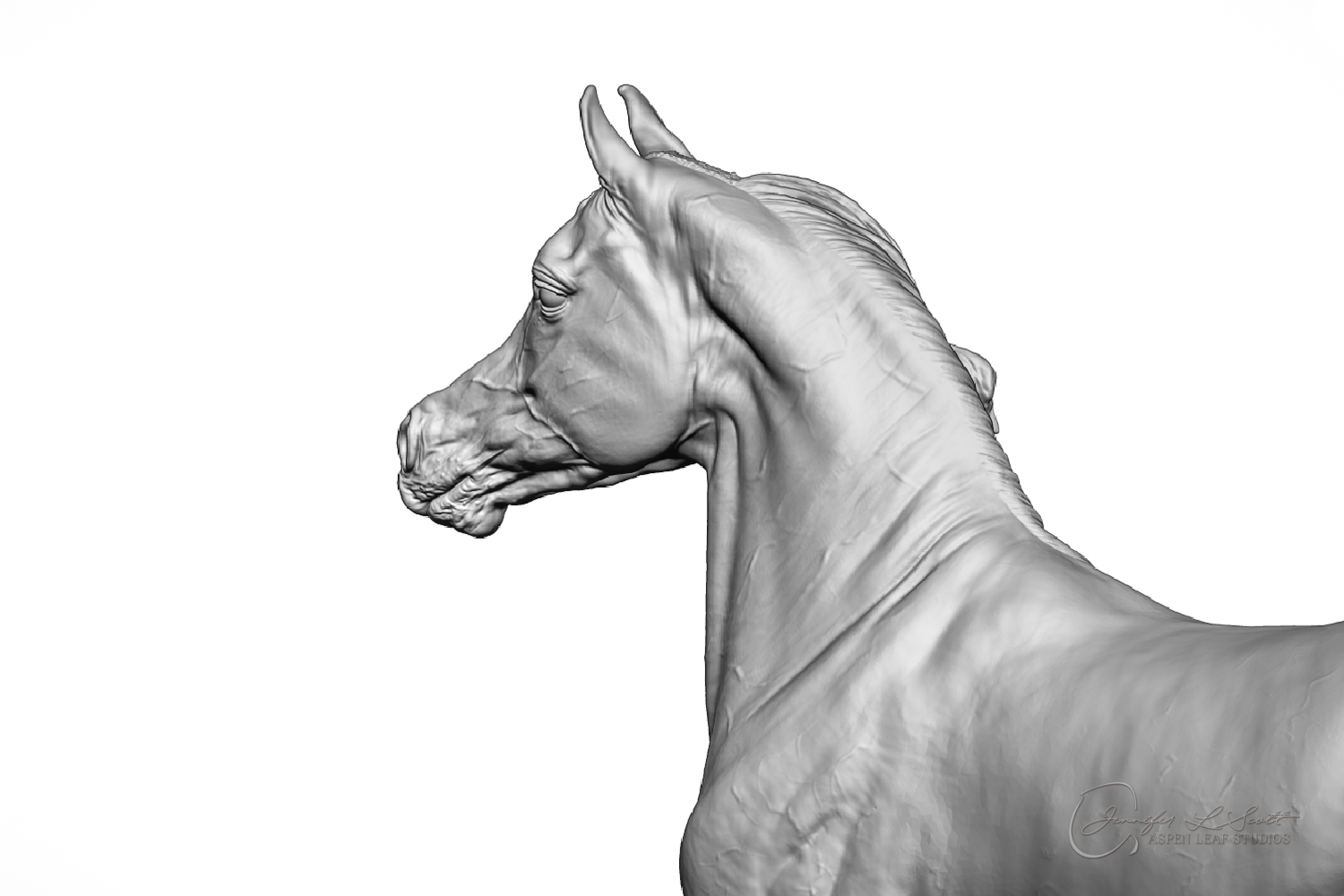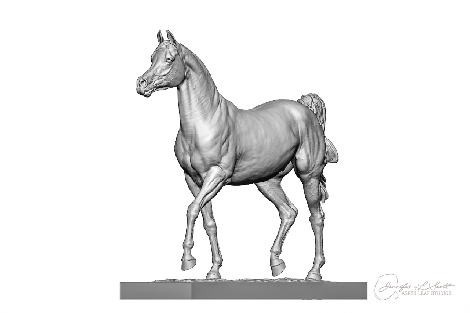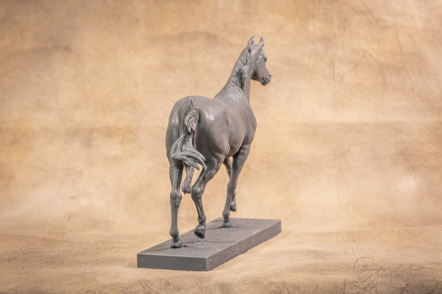 Talib (pronounced Tah-LEEB) is a plucky little (14 something hands high) representation of the Arabian. This sweet gelding is half-heartedly jigging /stepping towards something that's caught his attention. Perhaps his human has come to visit with treats? Because hims cute after all, and while clearly of good breeding this one is very much a pet. The most fun part of sculpting this piece was getting all that bendy Arabian movement. The nuances of gravity and weight shifts as he bends right, falling onto that inside shoulder. The step and support of the raised hip under his left hind and the drop of the opposite hip. The snakey-neck thing Arabians do. All of those shapes and details bring realism to this piece in ways that just sculpting pretty pieces can't. Then you add on that yummy texture and he's something that breathes. I'm so pleased with how he turned out.