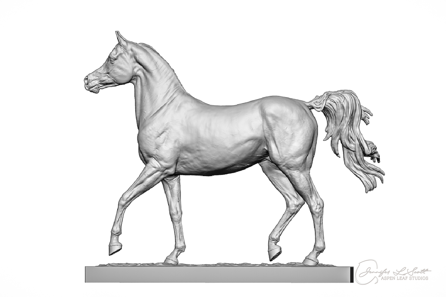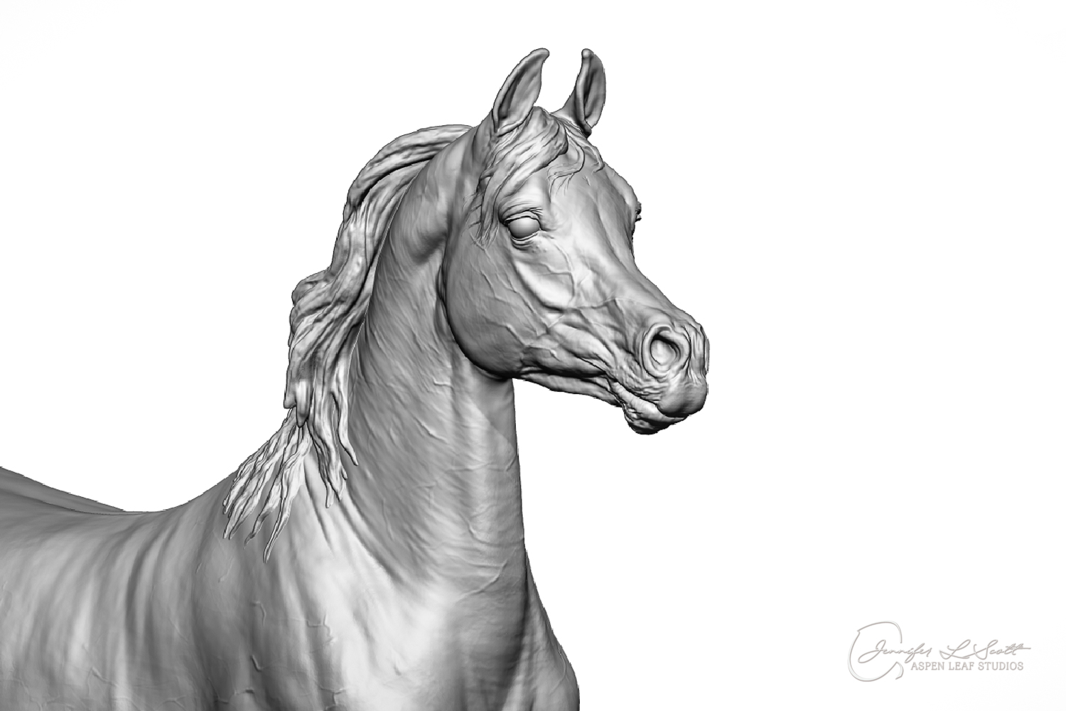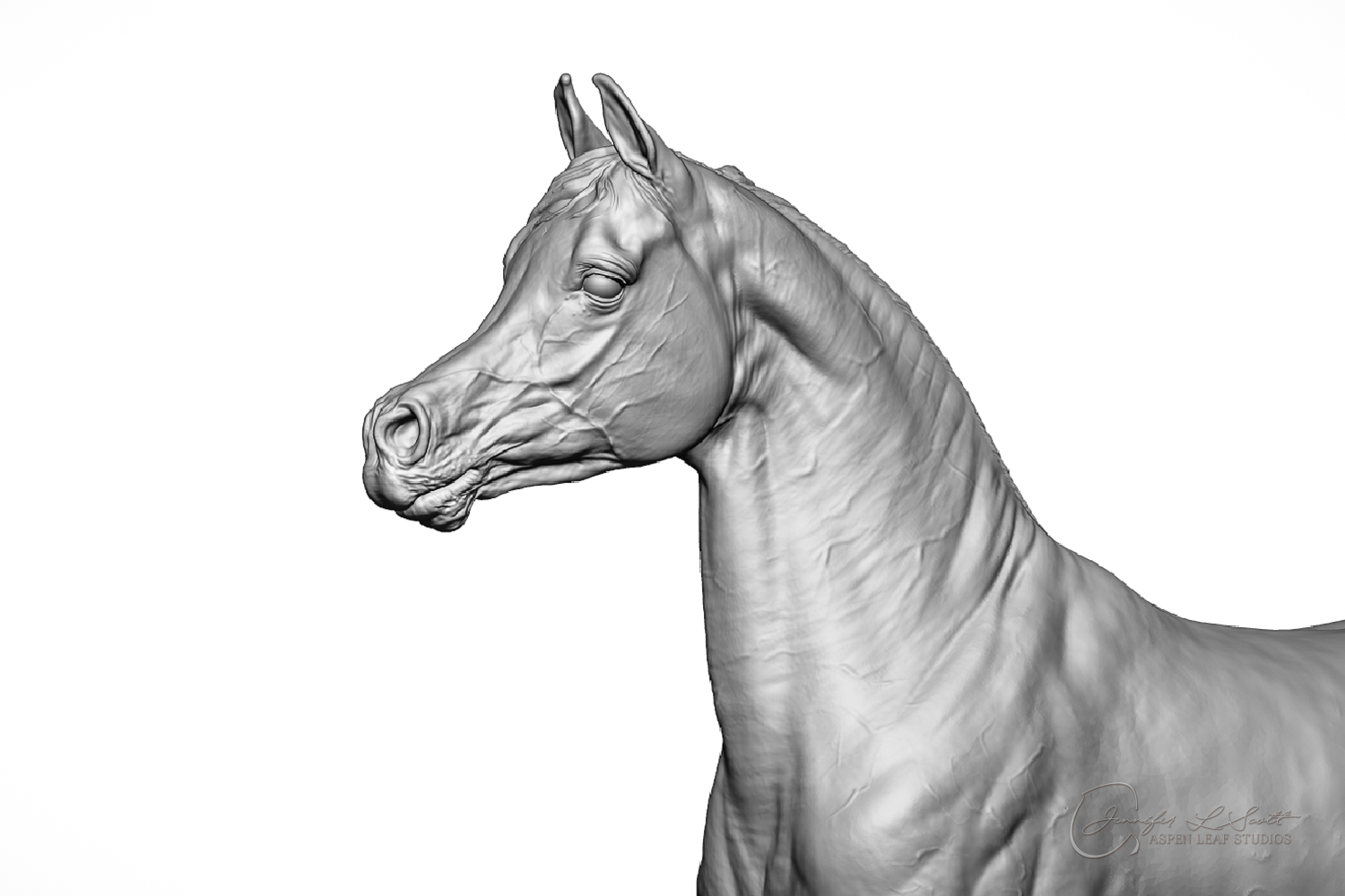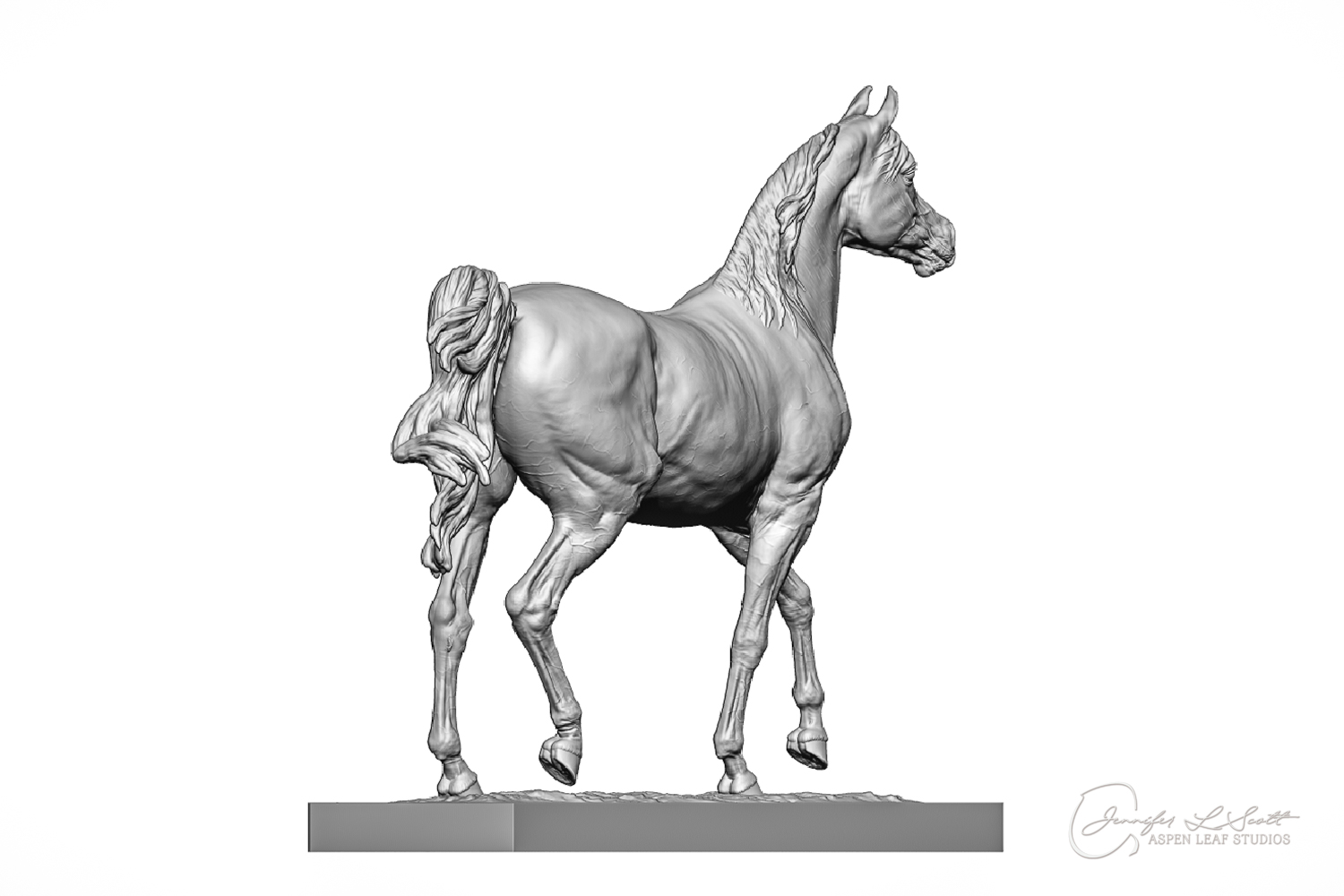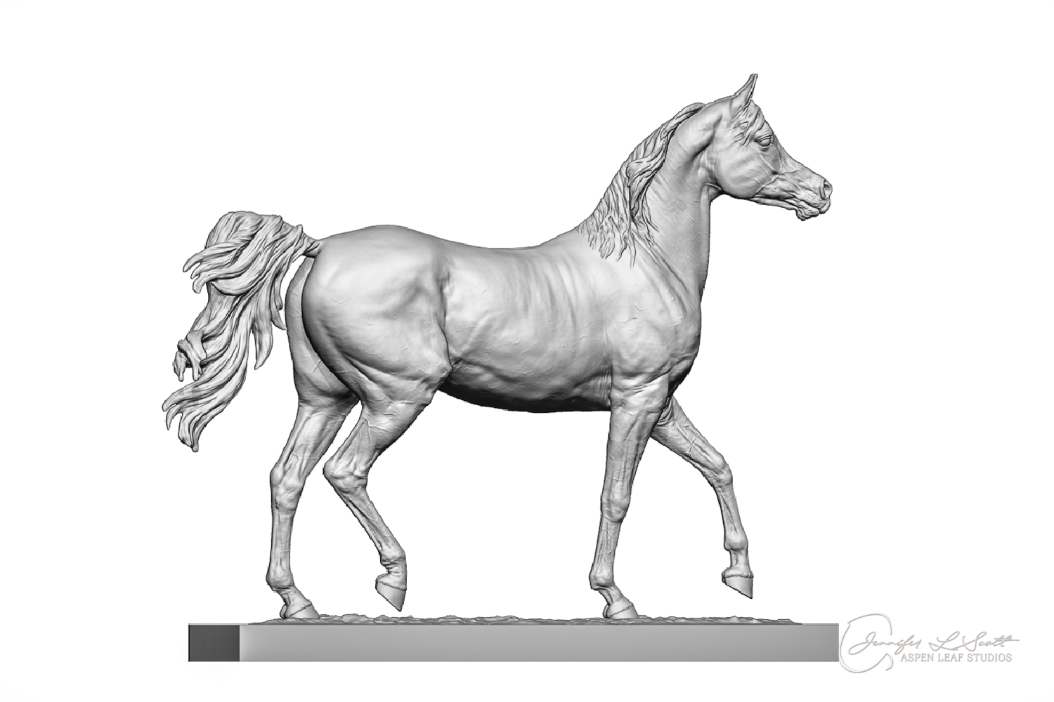 Talib (pronounced Tah-LEEB) is a plucky little (14 something hands high) representation of the Arabian. This sweet gelding is half-heartedly jigging /stepping towards something that's caught his attention. Perhaps his human has come to visit with treats? Because hims cute after all, and while clearly of good breeding this one is very much a pet. The most fun part of sculpting this piece was getting all that bendy Arabian movement. The nuances of gravity and weight shifts as he bends right, falling onto that inside shoulder. The step and support of the raised hip under his left hind and the drop of the opposite hip. The snakey-neck thing Arabians do. All of those shapes and details bring realism to this piece in ways that just sculpting pretty pieces can't. Then you add on that yummy texture and he's something that breathes. I'm so pleased with how he turned out.