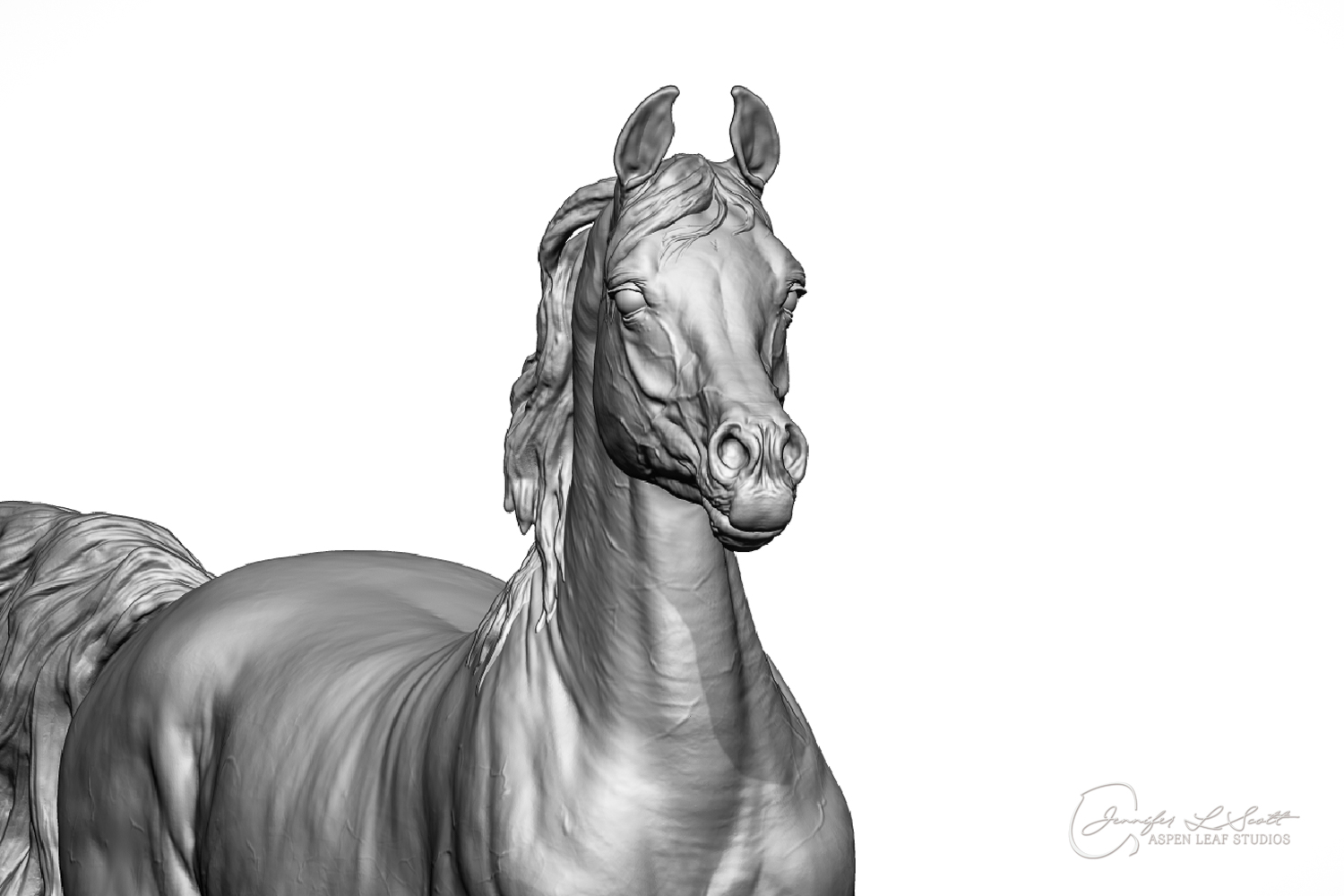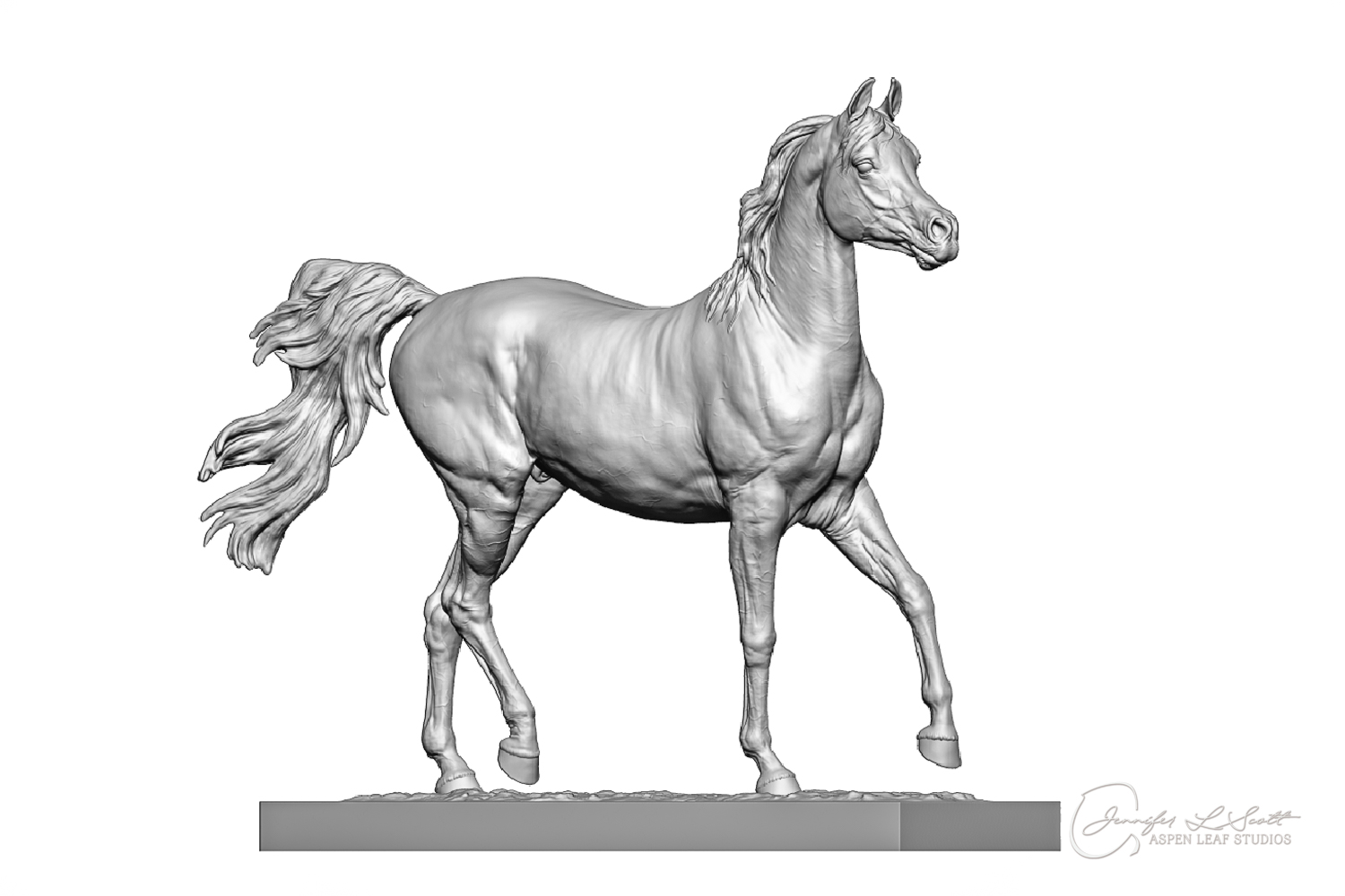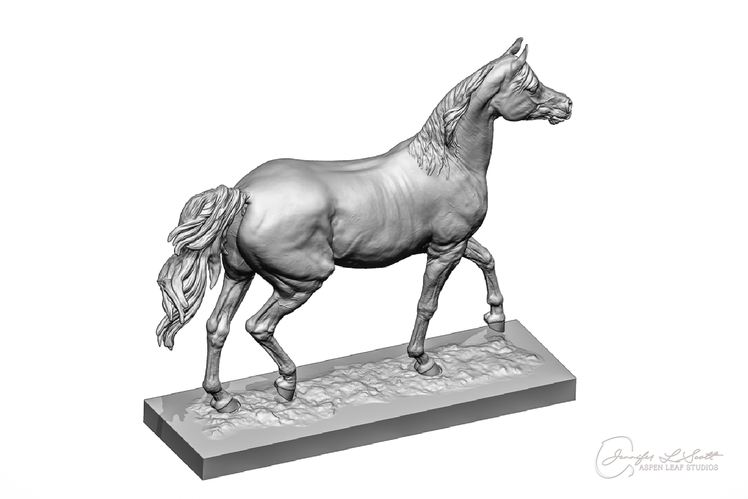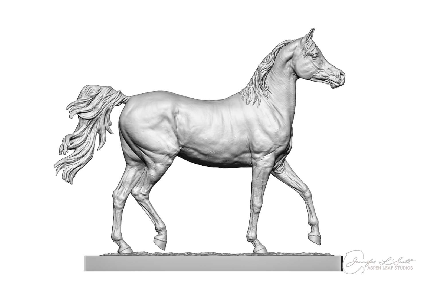 Talib (pronounced Tah-LEEB) is a plucky little (14 something hands high) representation of the Arabian. This sweet gelding is half-heartedly jigging /stepping towards something that's caught his attention. Perhaps his human has come to visit with treats? Because hims cute after all, and while clearly of good breeding this one is very much a pet. The most fun part of sculpting this piece was getting all that bendy Arabian movement. The nuances of gravity and weight shifts as he bends right, falling onto that inside shoulder. The step and support of the raised hip under his left hind and the drop of the opposite hip. The snakey-neck thing Arabians do. All of those shapes and details bring realism to this piece in ways that just sculpting pretty pieces can't. Then you add on that yummy texture and he's something that breathes. I'm so pleased with how he turned out.